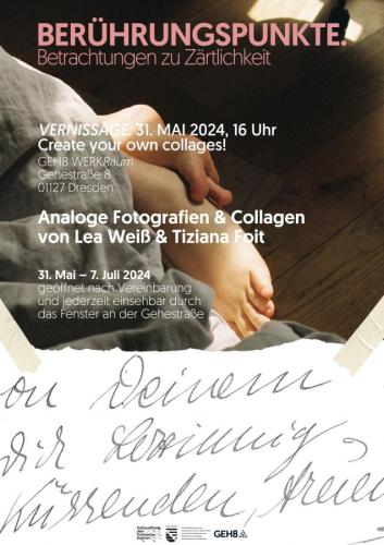 Flaum auf Haut, Blumen in der Küche, lange Sonntage unter der Bettdecke, gemeinsames Lachen und Tanzen. Zärtlichkeiten des Alltags kommen in der schnelllebigen Welt immer wieder zu kurz. Tiziana Foit und Lea Weiß betrachten in der Ausstellung „Berührungspunkte.” Empfindsamkeiten, die oft inmitten der Routinen des Lebens verloren gehen. Sie teilen ihre individuellen Blickwinkel auf Zärtlichkeit in Collagen und analogen Fotografien, zeigen und hinterfragen die Intimität und Emotionalität von Beziehungen sowie Momente der Selbstfürsorge. Es werden Ansätze sichtbar, der eigenen Sensibilität Raum zu geben und das persönliche, aber auch das gesellschaftliche Verständnis von Bindungen und Momenten der Zärtlichkeit abzubilden. Der Ausstellungsraum lädt dazu ein, in sonst so flüchtigen Gefühlen zu verweilen und die Berührungspunkte des eigenen Lebens zu reflektieren.
