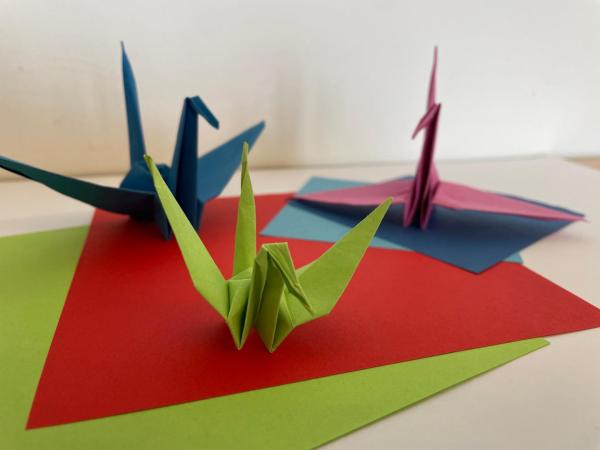 Das Mädchen Sadako Sasaki kennt in Japan jedes Kind. Sie lebte in der Stadt Hiroshima. Dort überlebte sie den Abwurf der Atombombe, war aber starker radioaktiver Strahlung ausgesetzt. Neun Jahre später erkrankte sie an Leukämie (Blutkrebs) und starb im Alter von 12 Jahren. Während ihrer Krankheit faltete sie viele Kraniche, denn eine japanische Legende besagt, dass ein Wunsch in Erfüllung geht, wenn man 1000 Kraniche faltet. Heute falten Menschen auf der ganzen Welt Kraniche in Erinnerung an Sadako und den Abwurf der Atombomben. An den Samstagnachmittagen in den Ferien laden wir dich und deine Familie zum Kranichfalten ein.