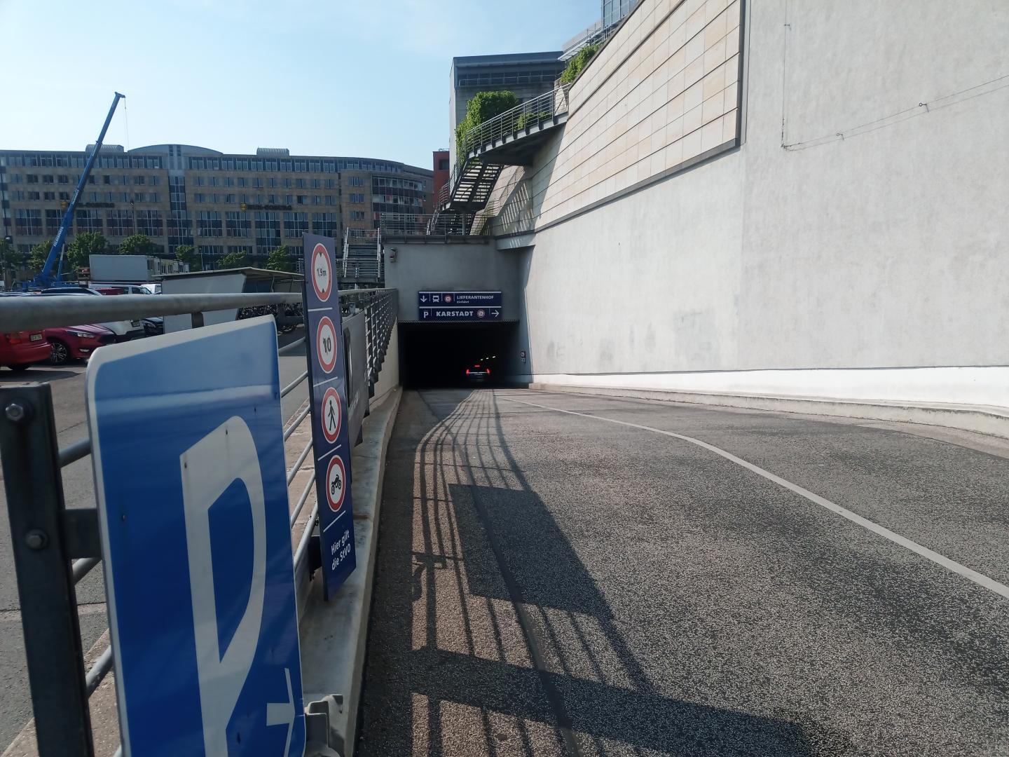 Die Tiefgarage ist Montag bis Samstag von 08:30 Uhr bis 20:00 Uhr geöffnet und nur während dieser Zeit barrierefrei über die Aufzüge im Karstadt zu erreichen.
