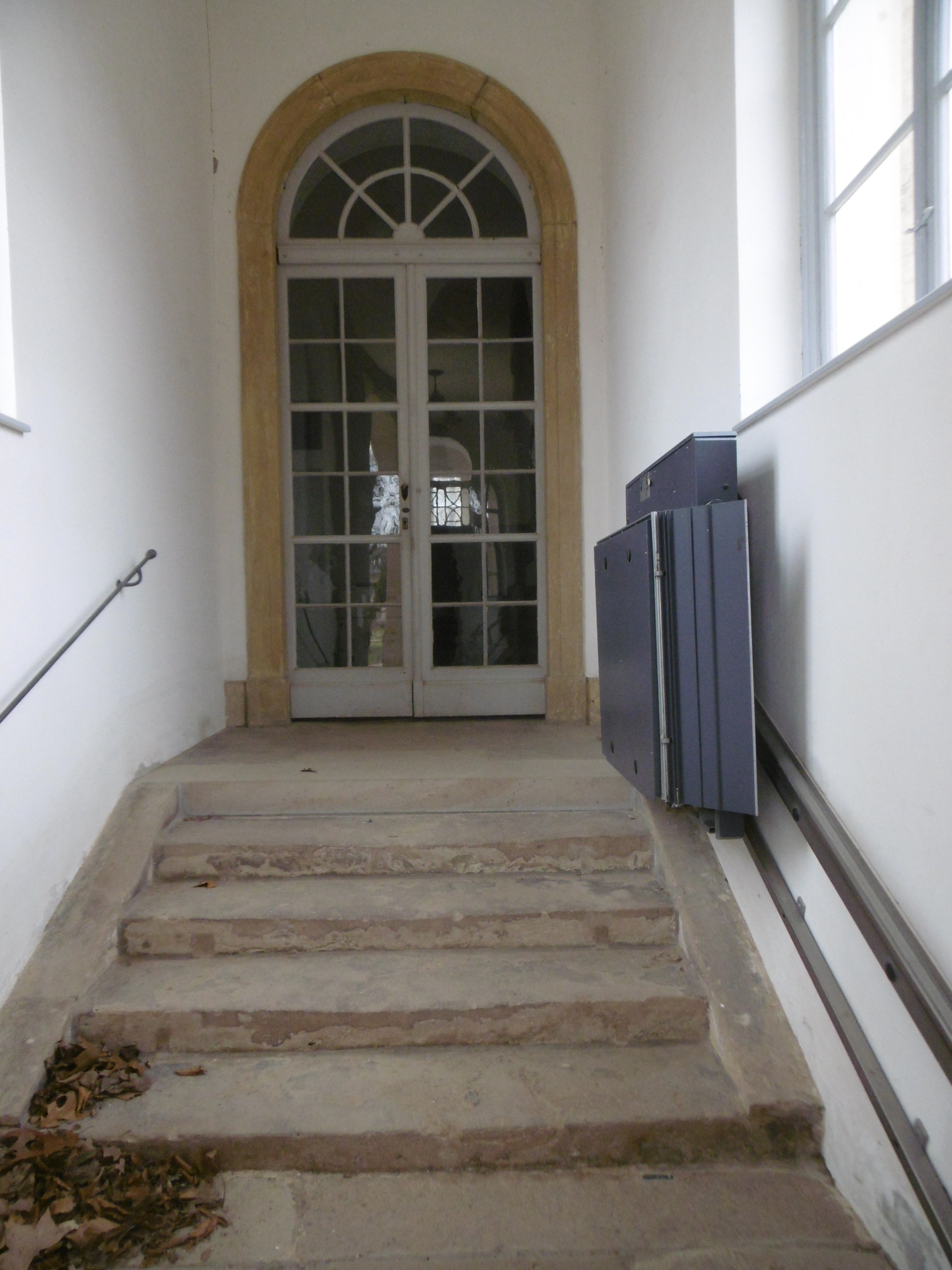 Der Zugang West zum Schlossareal vom Parkplatz Leonardo-da-Vinci-Straße ist ebenerdig. Der Zugang Ost vom Parkplatz Otto-Schindler-Straße ist über eine Rampe bei der Alten Wache (19 Meter lang, 9 Prozent Steigung, gepflastert) möglich. Beide Parkmöglichkeiten sind mehr als 400 Meter vom Schloßareal entfernt. Am Eingang West werden Karten über ein Fenster verkauft (Höhe des Tresens 120 Zentimeter). Am Eingang Ost werden Karten in der Alten Wache verkauft.