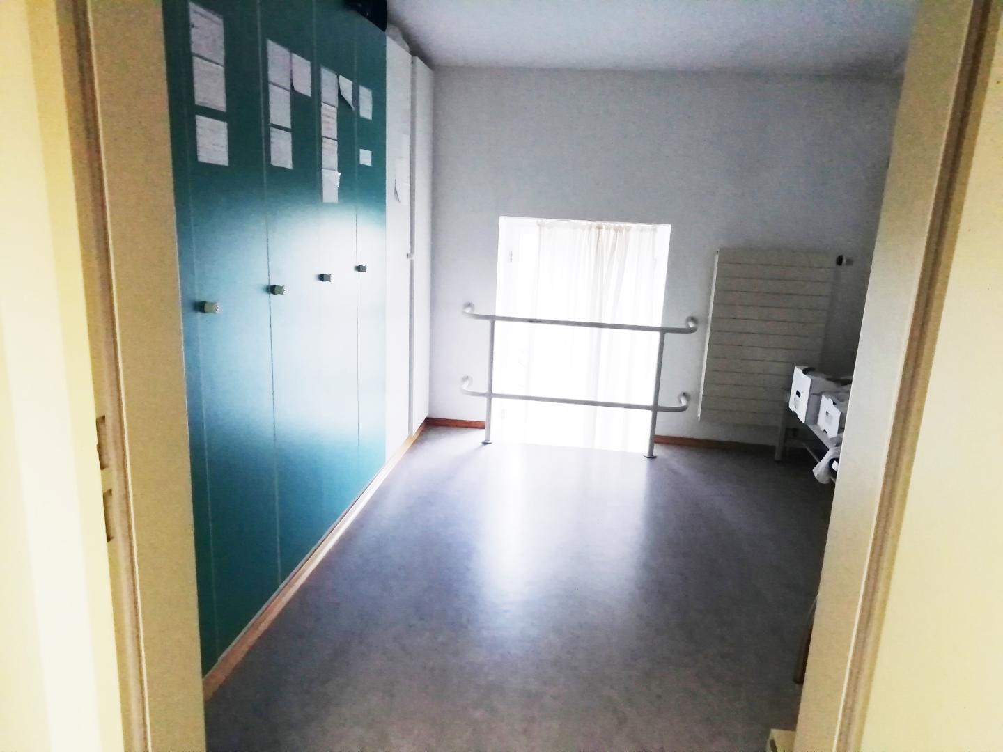 Dieser Eingang führt zu den Umkleiden und Garderoben. Das hinter dem Eingang befindliche Treppenhaus besteht zum Teil aus Wendeltreppen.