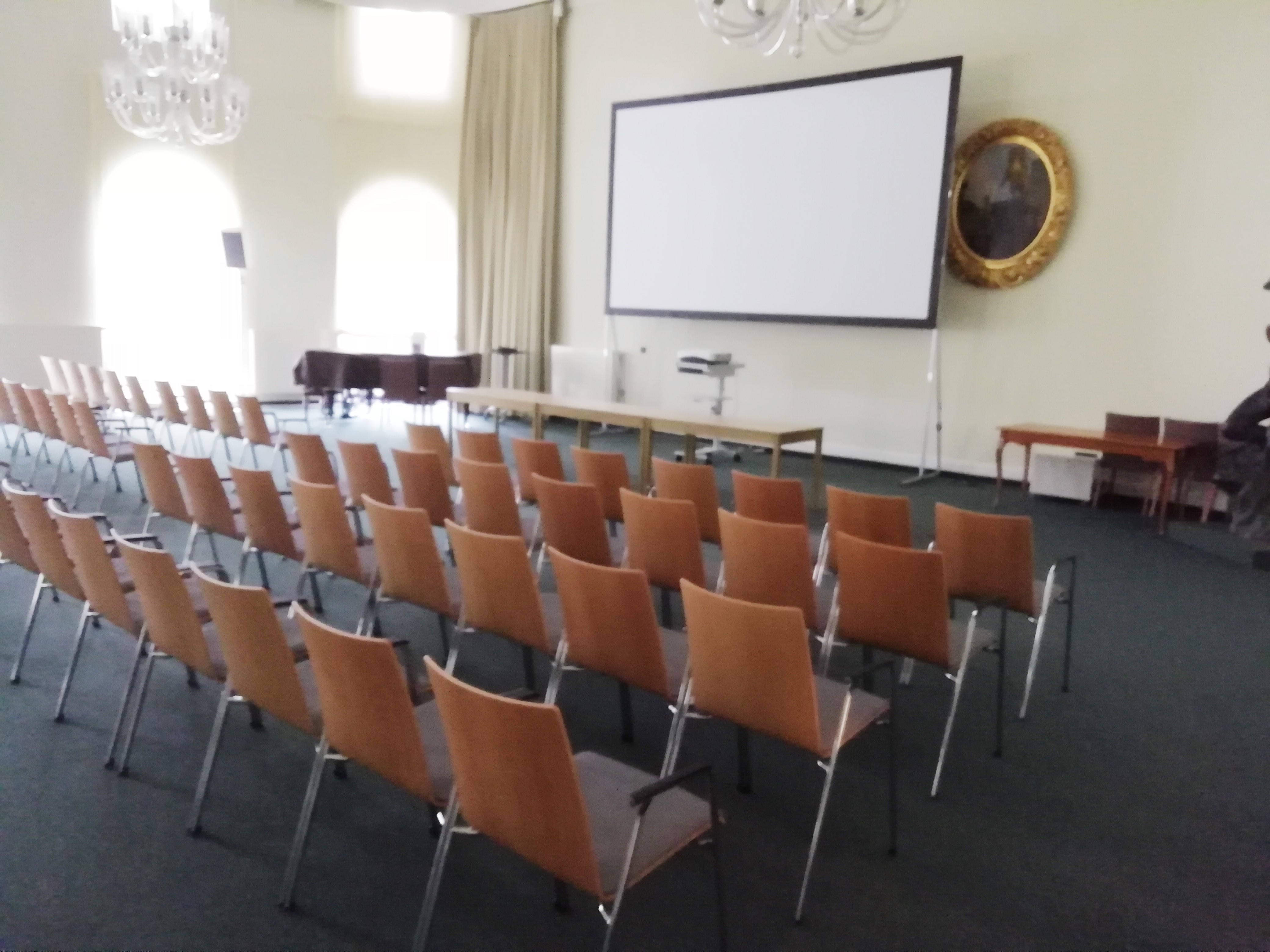 Es ist ein Beamer und ein großer Bildschirm vorhanden.