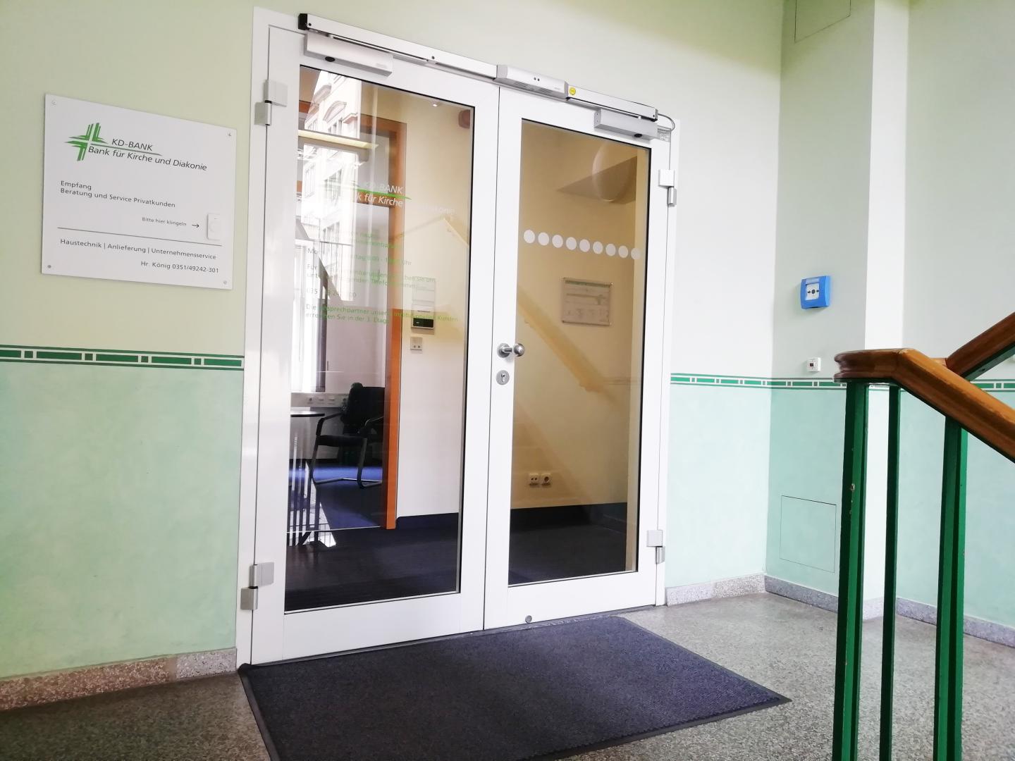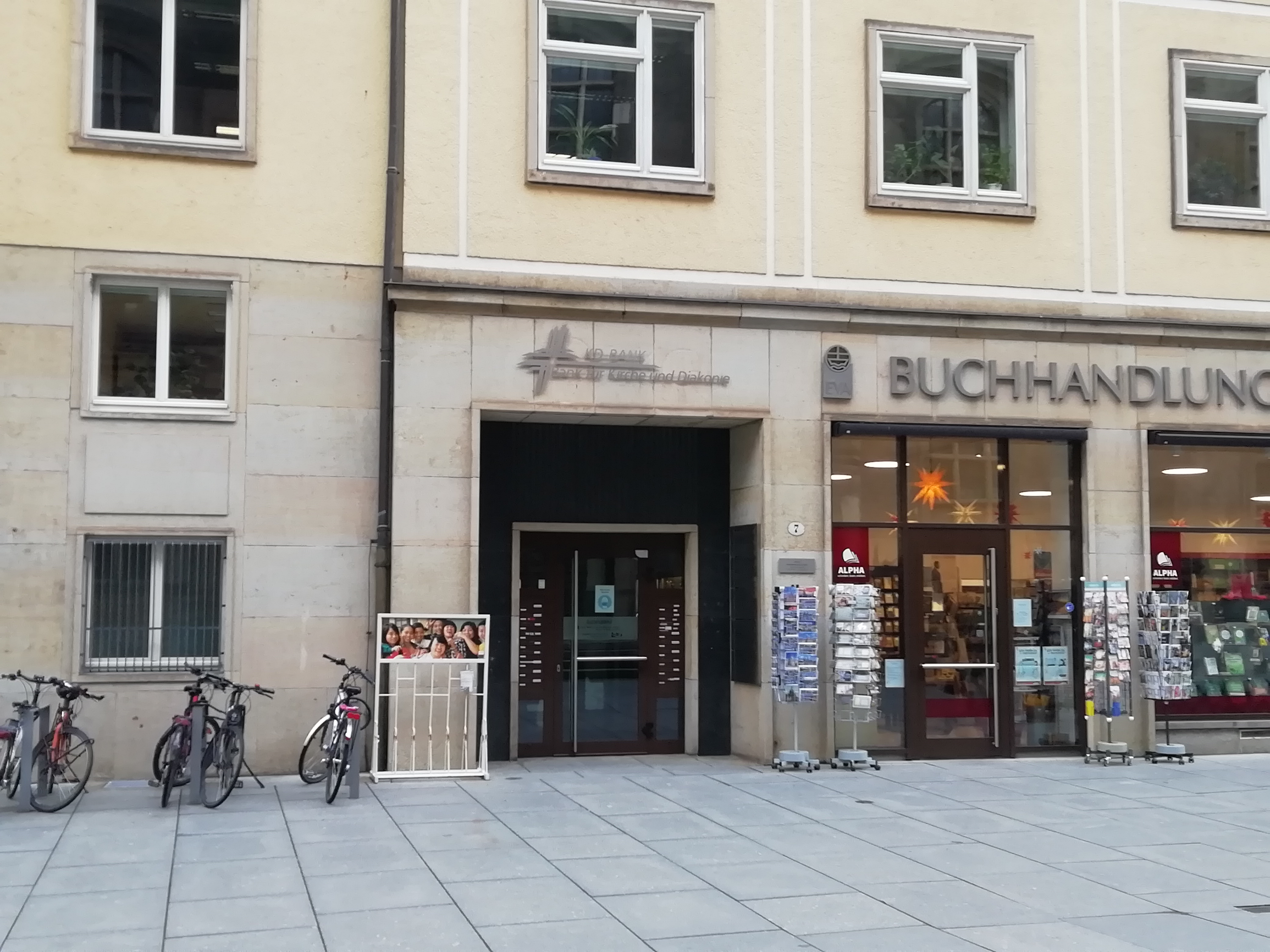 Die Einrichtung befindet sich im 1. Obergeschoss des Gebäudes. Der SB-Geldautomat ist im Erdgeschoss auf der rechten Seite des Gebäudes.