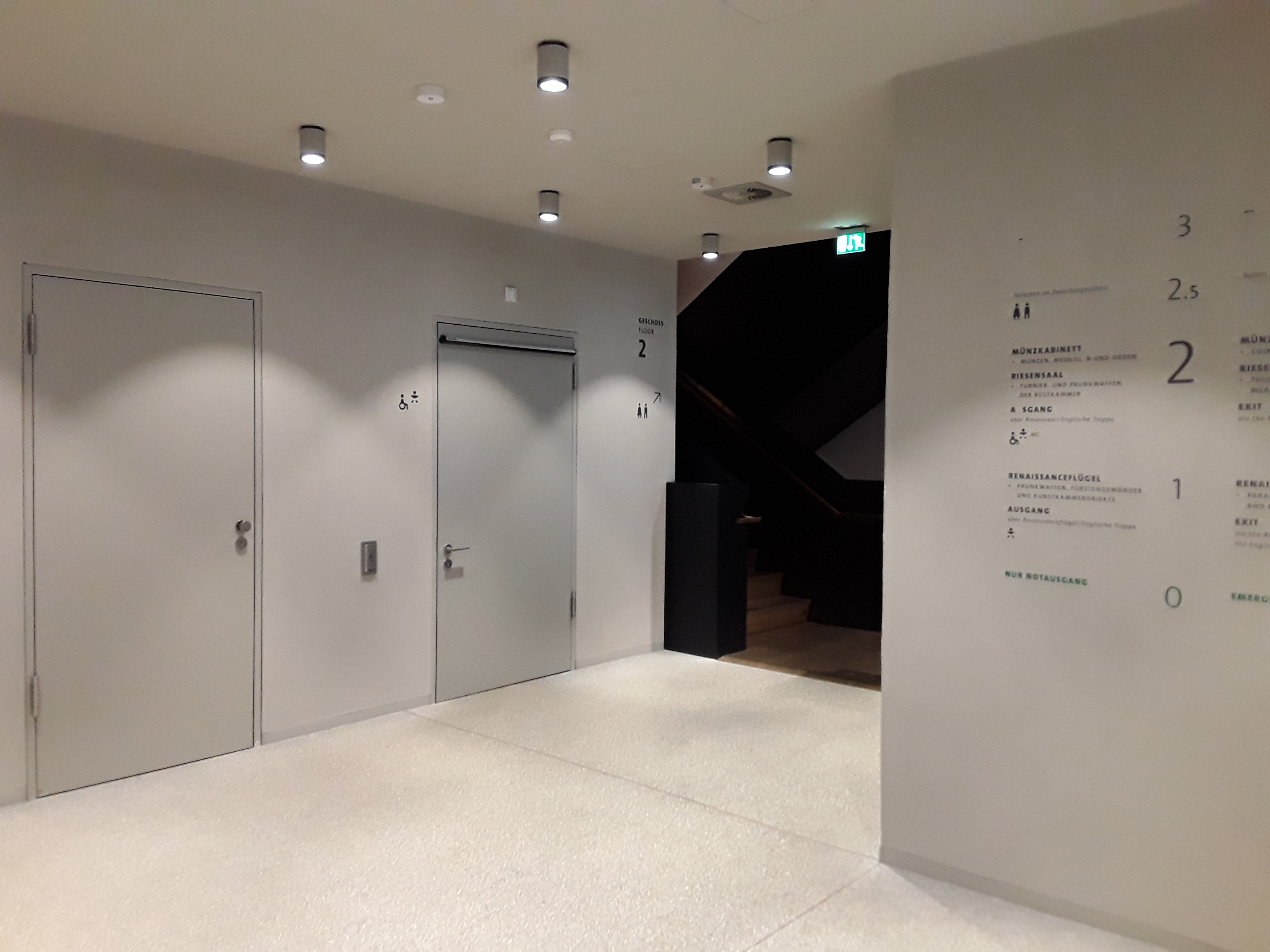 Das Rollstuhl-WC im 2. Obergeschoss befindet sich im Bereich des Treppenhaus am Münzkabinett beziehungsweise Silberwaffensaal.