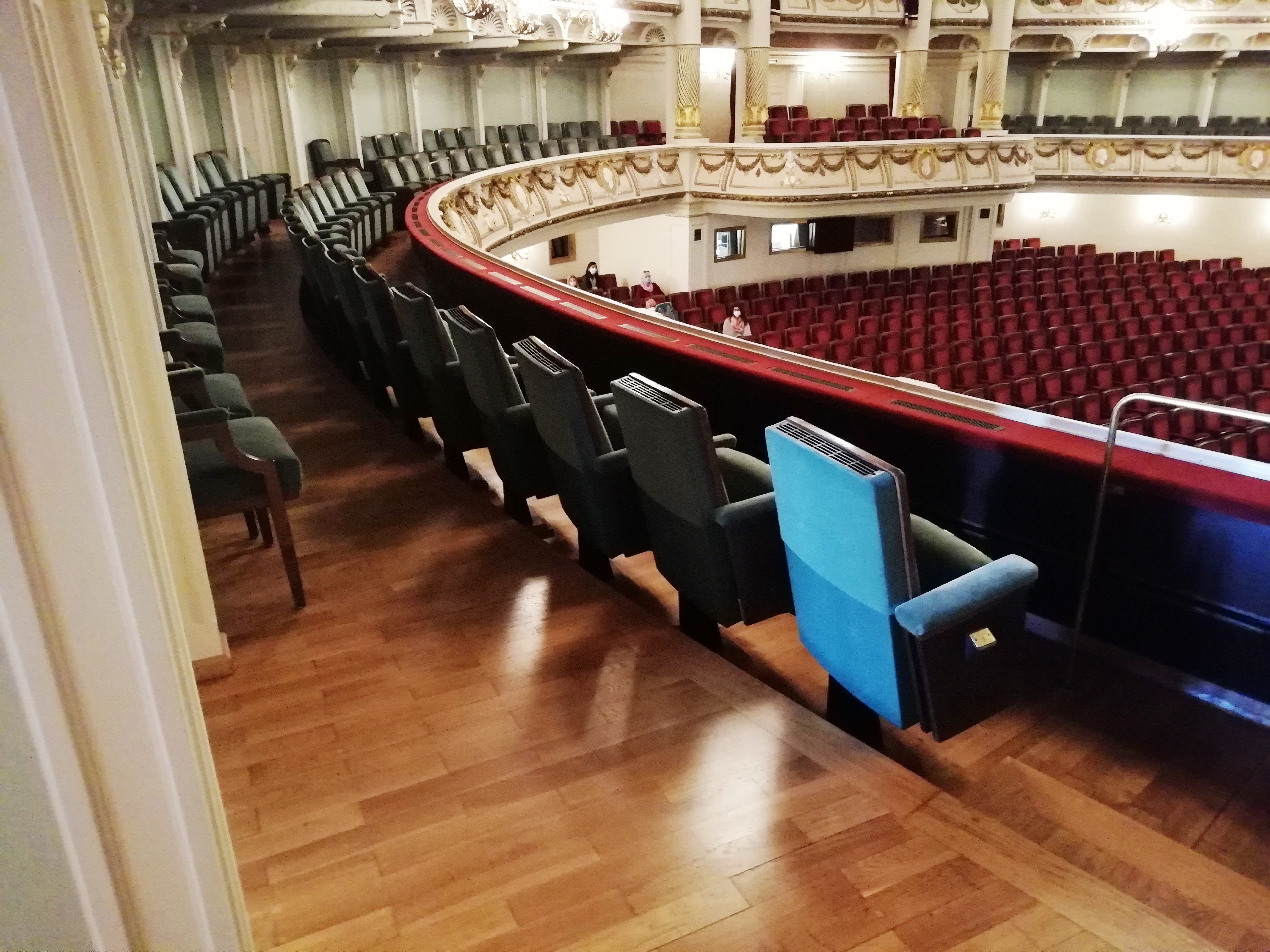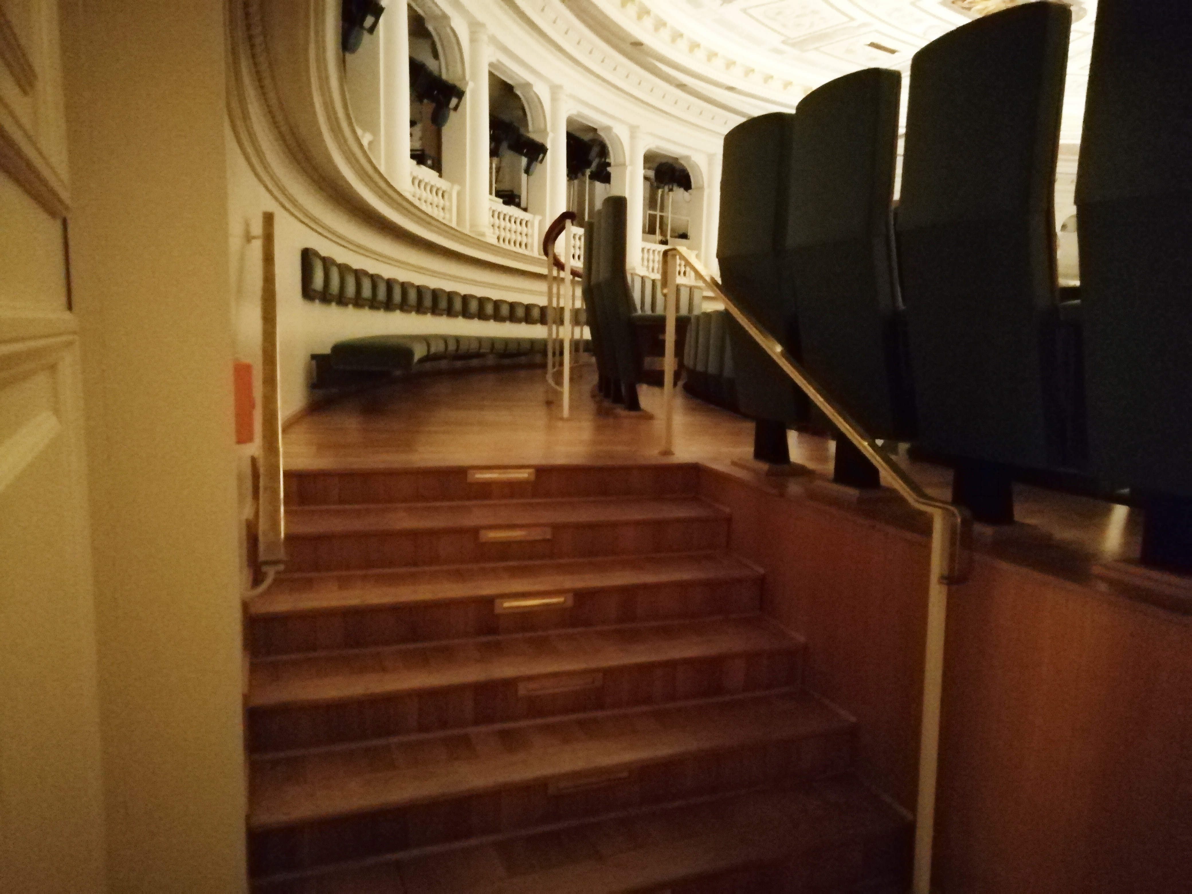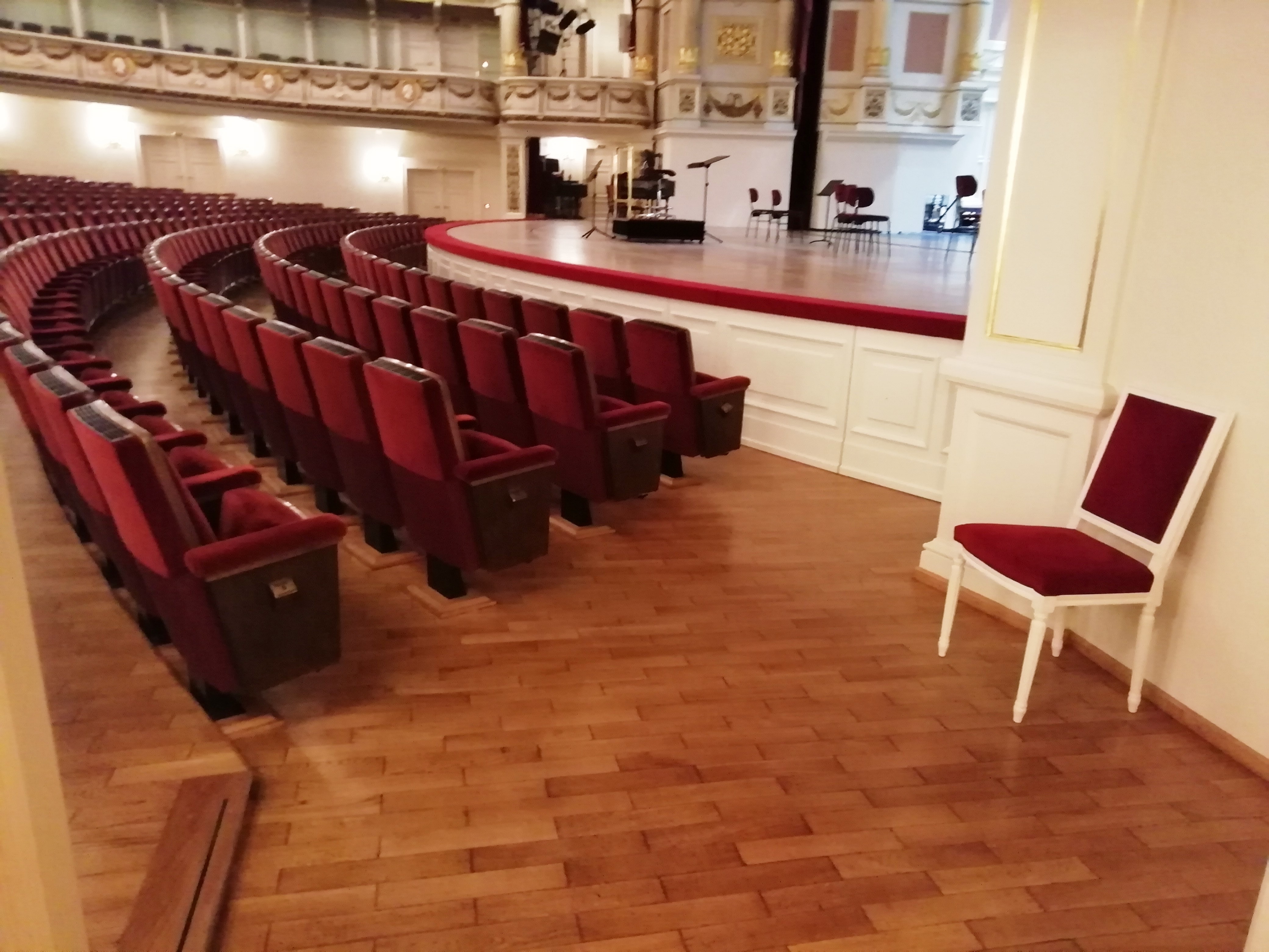 In den Rängen 1 und 2 kann zu Gunsten eines Rollstuhls zusätzlich zur festen Bestuhlung frei bewegliche Stühle aus dem Saal entfernt werden.