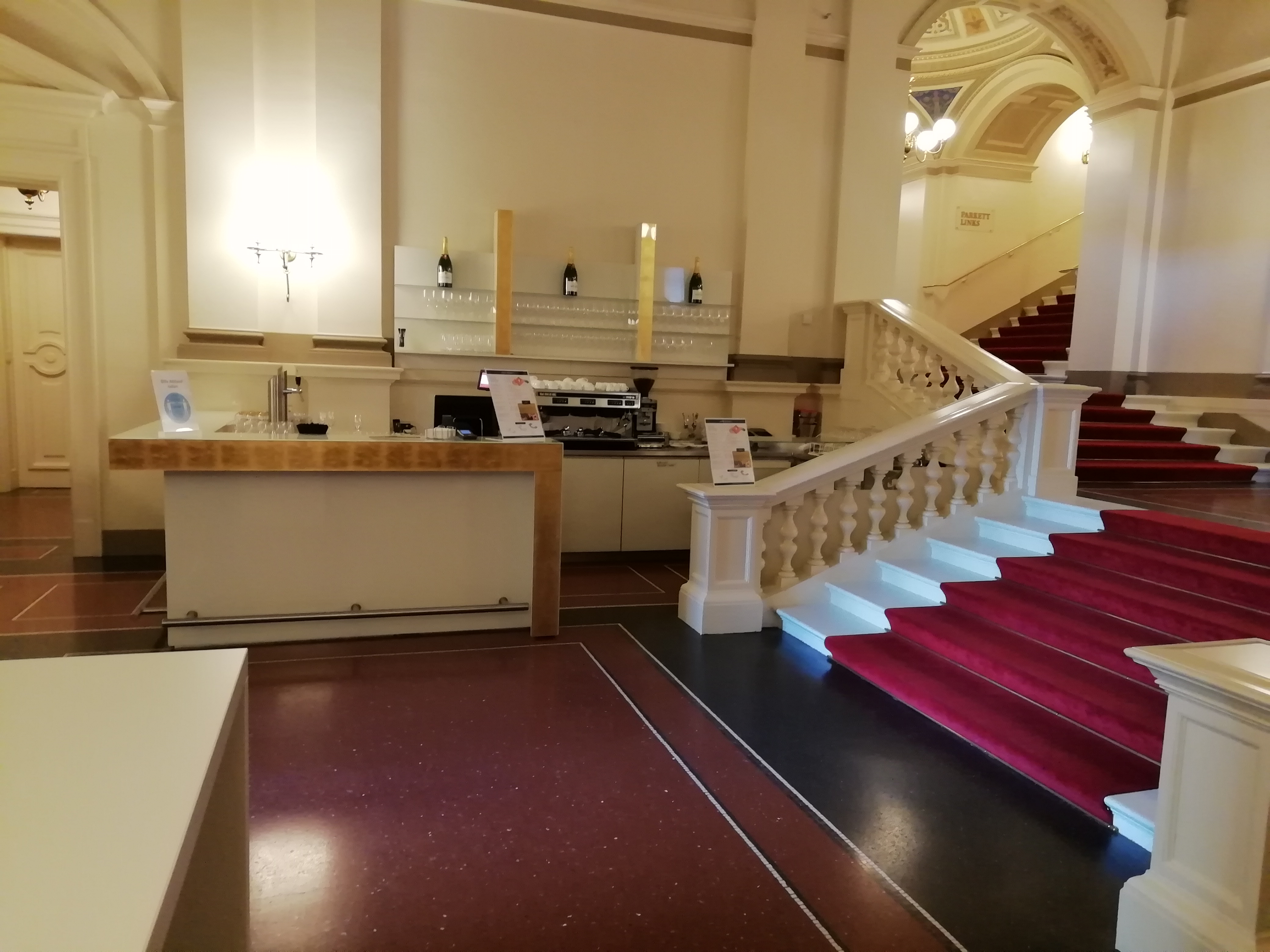 Es befinden sich 2 Bereiche der Gastronomie im Erdgeschoß. Beide sind nur über eine Treppe erreichbar.