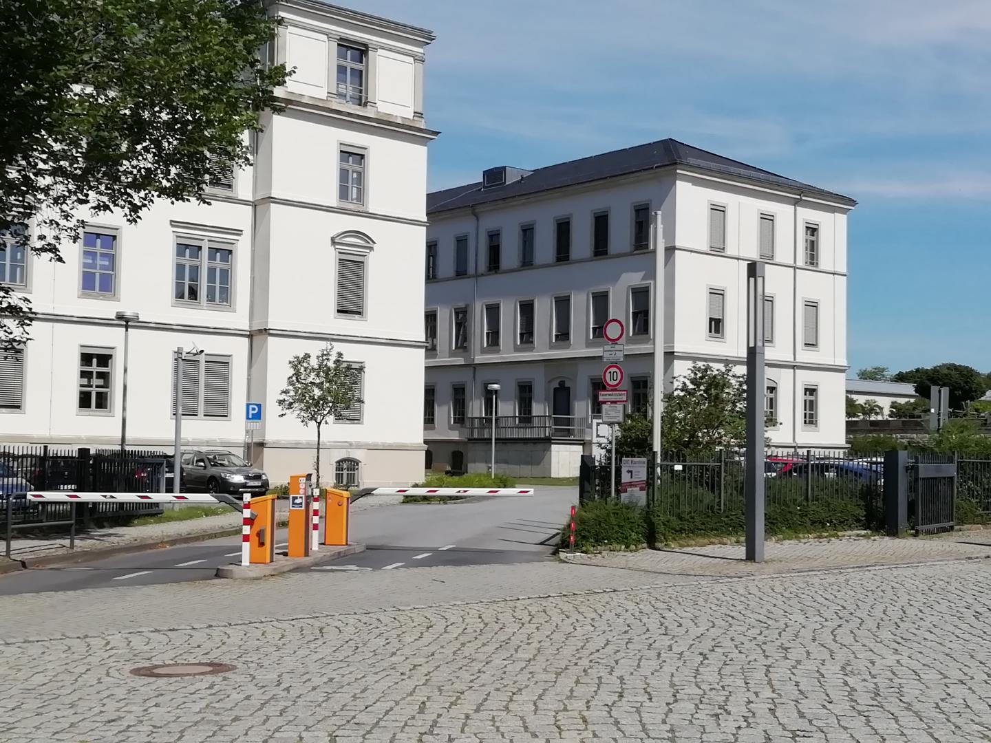 With the following obstacles: The property's parking lot is in the inner courtyard. There is a barrier with a bell and intercom at the entrance.