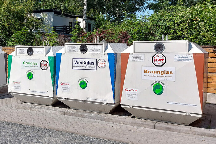 Es gibt Container für weiße, braune und grüne Flaschen.