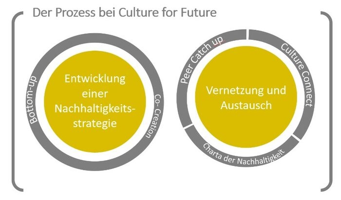 Im Zentrum des Projektes steht der partizipative Gedanke – die Kultureinrichtungen sollen vor allem dabei unterstützt werden, ihre Maßnahmen in einem Prozess der Teilhabe zu starten. Dadurch werden alle Mitarbeitenden auf der Nachhaltigkeitsreise mitgenommen und können selbst zu Akteuren zu werden. Durch die „bottom-up“-Entwicklung entwickeln sie ein hohes Maß an Identifikation mit der Nachhaltigkeitsstrategie. Darüber hinaus ermöglicht die Einbindung von Mitarbeitenden aus allen Bereichen eine enge Verzahnung der Nachhaltigkeitsmaßnahmen mit der alltäglichen Arbeit und schafft damit die Grundlage dafür, dass die Nachhaltigkeitsstrategie gelebt und umgesetzt wird.
