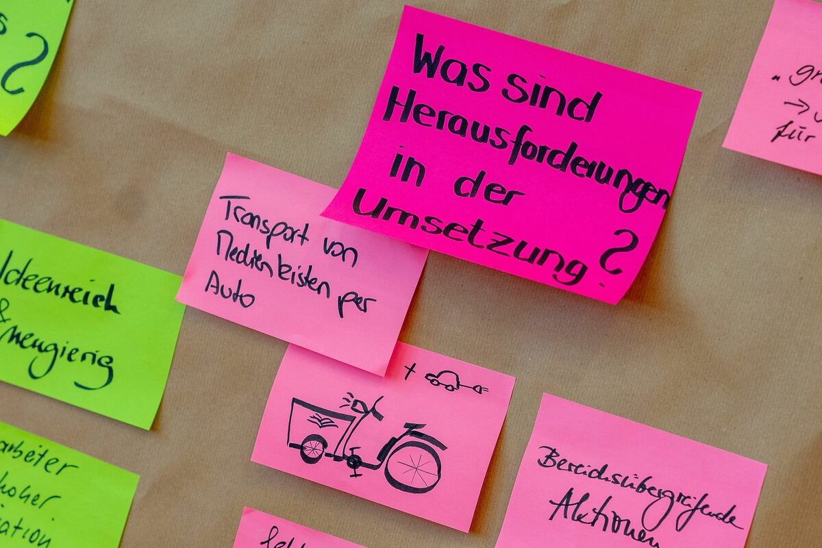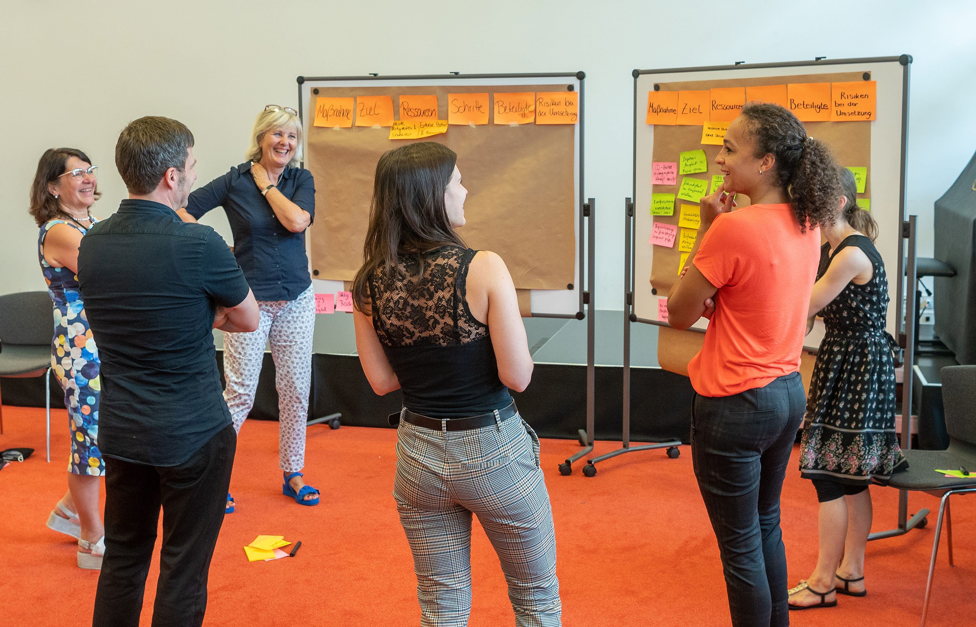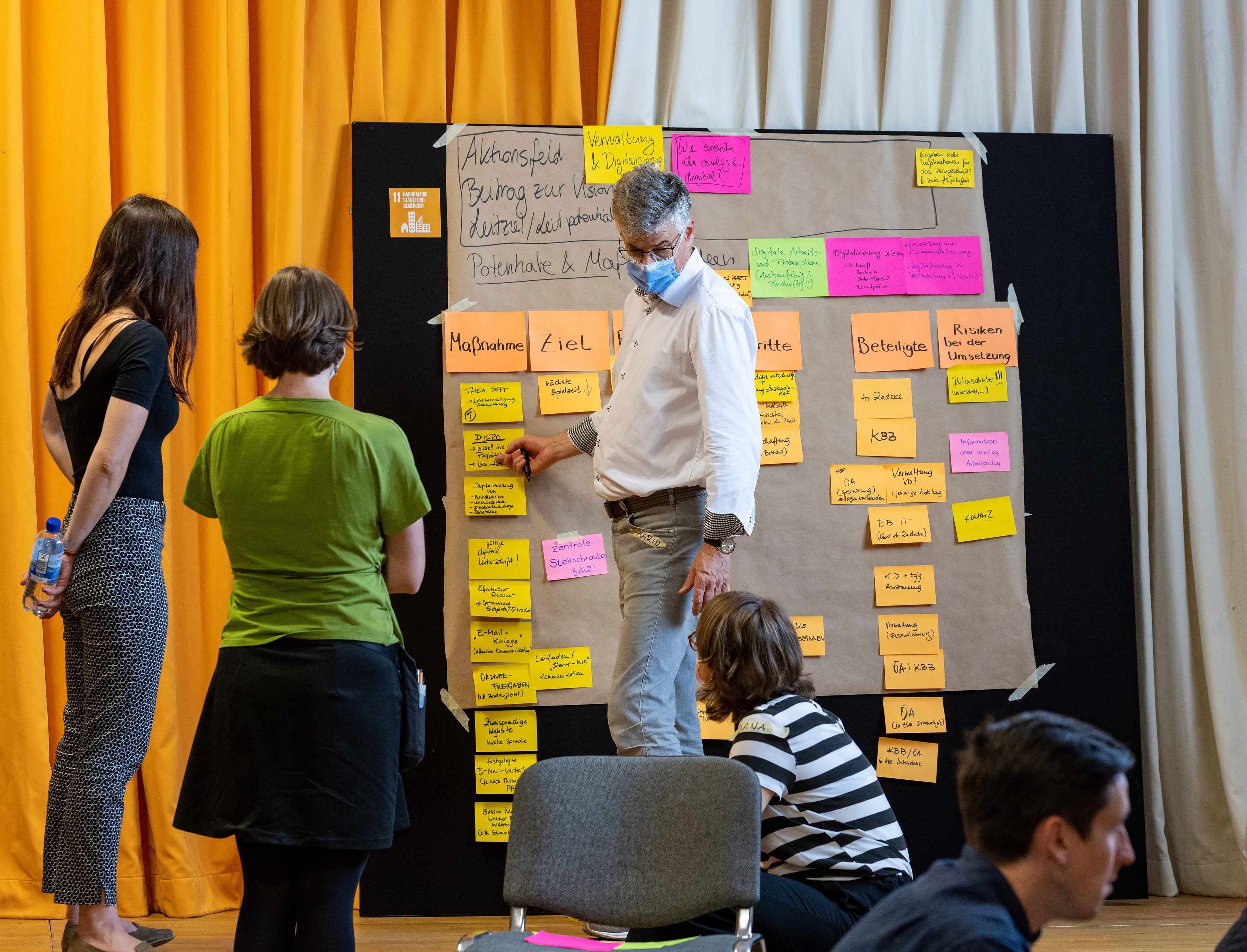 Im ersten Workshop wurde jeweils gemeinsam mit Mitarbeitenden eine Vision von Nachhaltigkeit entwickelt und das Zukunftsbild innerhalb verschiedener Aktionsfelder ausdifferenziert. Für die Erreichung der Leitziele wurden innerhalb Aktionsfelder in einem weiteren Workshop konkrete Maßnahmen erarbeitet und in der abschließenden Veranstaltung deren Umsetzung, Verstetigung und Berichterstattung durch die Entwicklung geeigneter Wirkungsindikatoren gefördert (Co-Creation).