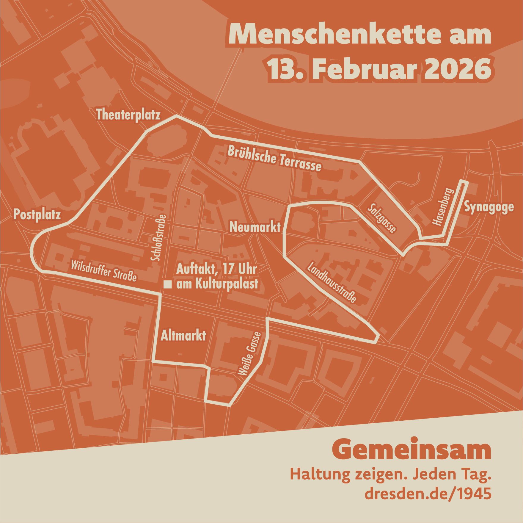 Wir laden alle Dresdnerinnen und Dresdner ein, sich am 13. Februar 2026 an der Menschenkette zu beteiligen und gemeinsam ein sichtbares Zeichen zu setzen: für Demokratie in Frieden und für ein solidarisches Miteinander in Vielfalt.