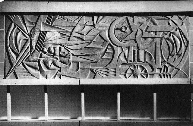 Das 30 Meter lange Wandbild „Der Weg der Roten Fahne“ entsteht zwischen 1968 und 1969. Gestaltet und umgesetzt wird es von einer Künstlergruppe um Gerhard Bondzin, Professor an der Dresdner Hochschule für Bildende Künste. Es zeigt im Stile des sozialistischen Realismus den Weg zum Sozialismus und stellt die DDR in den Kontext des damaligen Geschichtsbildes. Der in einem vorherigen Wettbewerb ausgewählte Siegerentwurf von Rudolf Sitte zum Thema „Die Veränderbarkeit der Welt“ wurde verworfen.