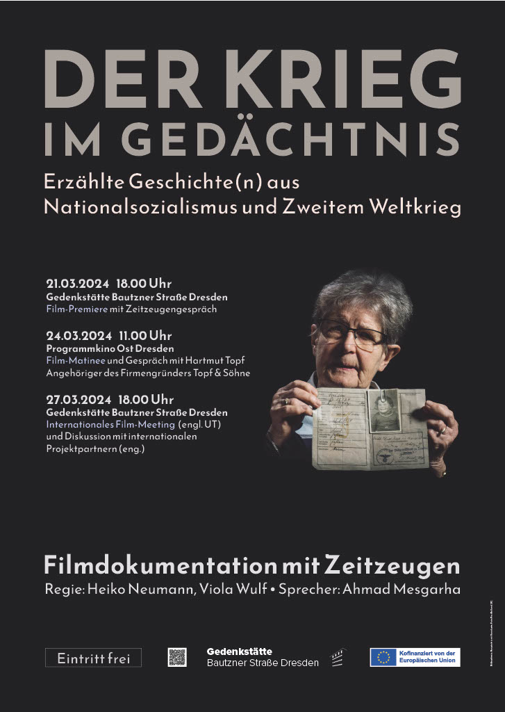 Am Donnerstag, 21. März 2024, 18 Uhr hat im Festsaal der Gedenkstätte Bautzner Straße Dresden, Bautzner Straße 112 a, der Dokumentarfilm „Der Krieg im Gedächtnis. Erzählte Geschichte(n) aus Nationalsozialismus und Zweitem Weltkrieg“ Premiere.
