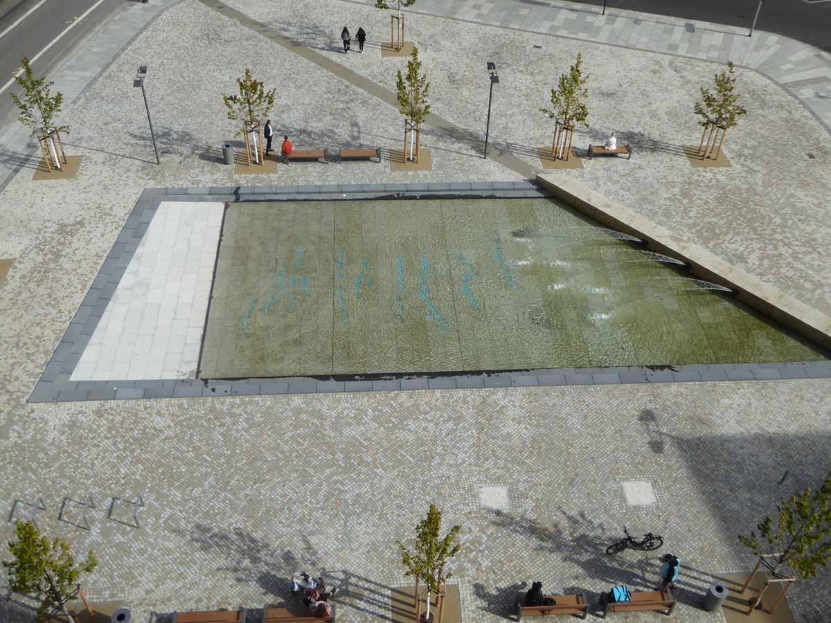 Die Betrachtenden, die in die Brunnenanlage hineinschauen und auch hineinlaufen können, werden hier mit der feinsinniger Sprachästhetik in Zusammenhang mit dem Wasser konfrontiert. Die Kürze des Textes erspart eine Überforderung bei der wahrnehmenden Betrachtung.