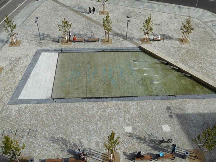 Das Wasserbecken der Brunnenanlage am Postplatz Dresden erinnert mit der Sandsteinmauer an der südlichen Einfassung und mit den daraus sprudelnden Wasserzuläufen an den ehemaligen Festungsgraben mit der Bastion Saturn.