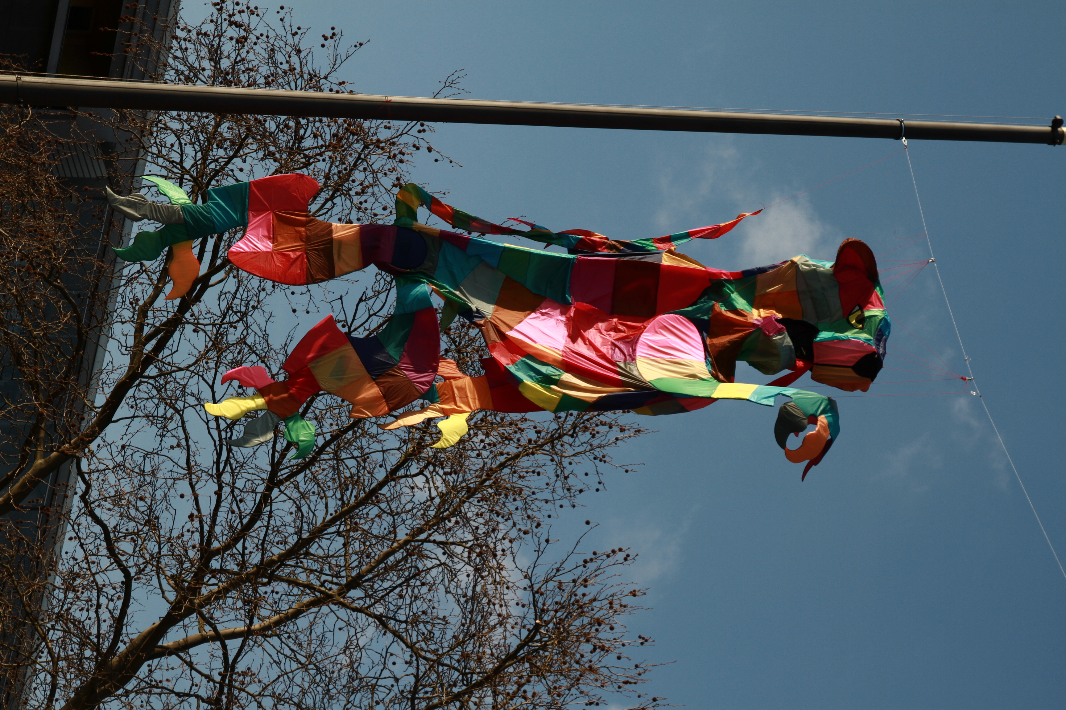 Vier Wochen hingen hier an exponierter Stelle ein roter Vorhang und ein durch Wind animiertes Wappentier dem Goldenen Reiter gegenüber.