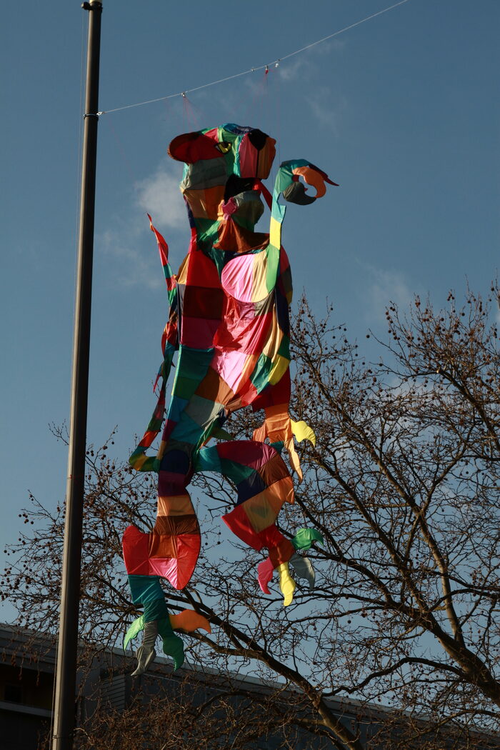 Das Zeichen des Löwen symbolisiert unbändige Kraft und Stärke, die gleichermaßen domestiziert, in einer Hälfte des Schildes eingefasst wurde. Heraldisch und ursprünglich steht der Löwe für die Abhängigkeit der Stadt von den Markgrafen, die seit der zweiten Hälfte des 15. Jahrhunderts in Dresden residierten. Bei Beatrice Jugert wurde der Löwe jedoch zu einem bunt gefleckten Wappentier: „ein Hybridwesen aus Löwe und dummen August“, wie sie selber beschreibt. So aus seinem Wappenschild befreit, wartet die leere Löwenhülle auf einen Windzug, der sie belebt – und jene bunte Lebendigkeit ist es ja auch, die der alten Residenzstadt gar nicht oft genug Luft und Auftrieb geben kann und sollte.