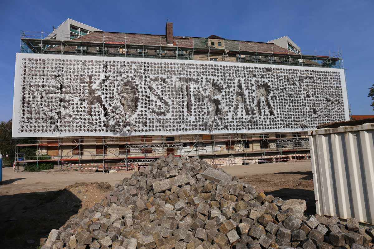 In der Mitte verdichten sich die Bohrlöcher zu dem Schriftzug KOSTBAR. In bildhauerischer Manier hat van Luyk in ihrem Atelier die Vorlage für das Motiv geschaffen, indem sie Gipskartonplatten systematisch mit der Bohrmaschine punktierte. Damit vollzog sie einen Akt der Zerstörung, der auch nach der Vergrößerung auf monumentales Bannerformat genauso wirkt. Nicht von ungefähr lässt das so entstandene Muster auch an Einschusslöcher und Gewalt denken. Was hierzulande schon lange nicht mehr präsent ist, ist andernorts noch bittere Lebensrealität. Und so verdeutlichte die Arbeit auch: KOSTBAR ist alles, was Menschen Obdach und Existenzmöglichkeiten bietet. Insofern verhüllt die Künstlerin das Gebäude nicht wirklich, sondern enthüllt es symbolisch als versehrt und verletzlich. Dabei wurde die Verbindung der Arbeit mit der aktuellen Rekonstruktionssituation dadurch verstärkt, dass das Banner unmittelbar an dem Gebäude umgebenden Gerüst montiert wurde.