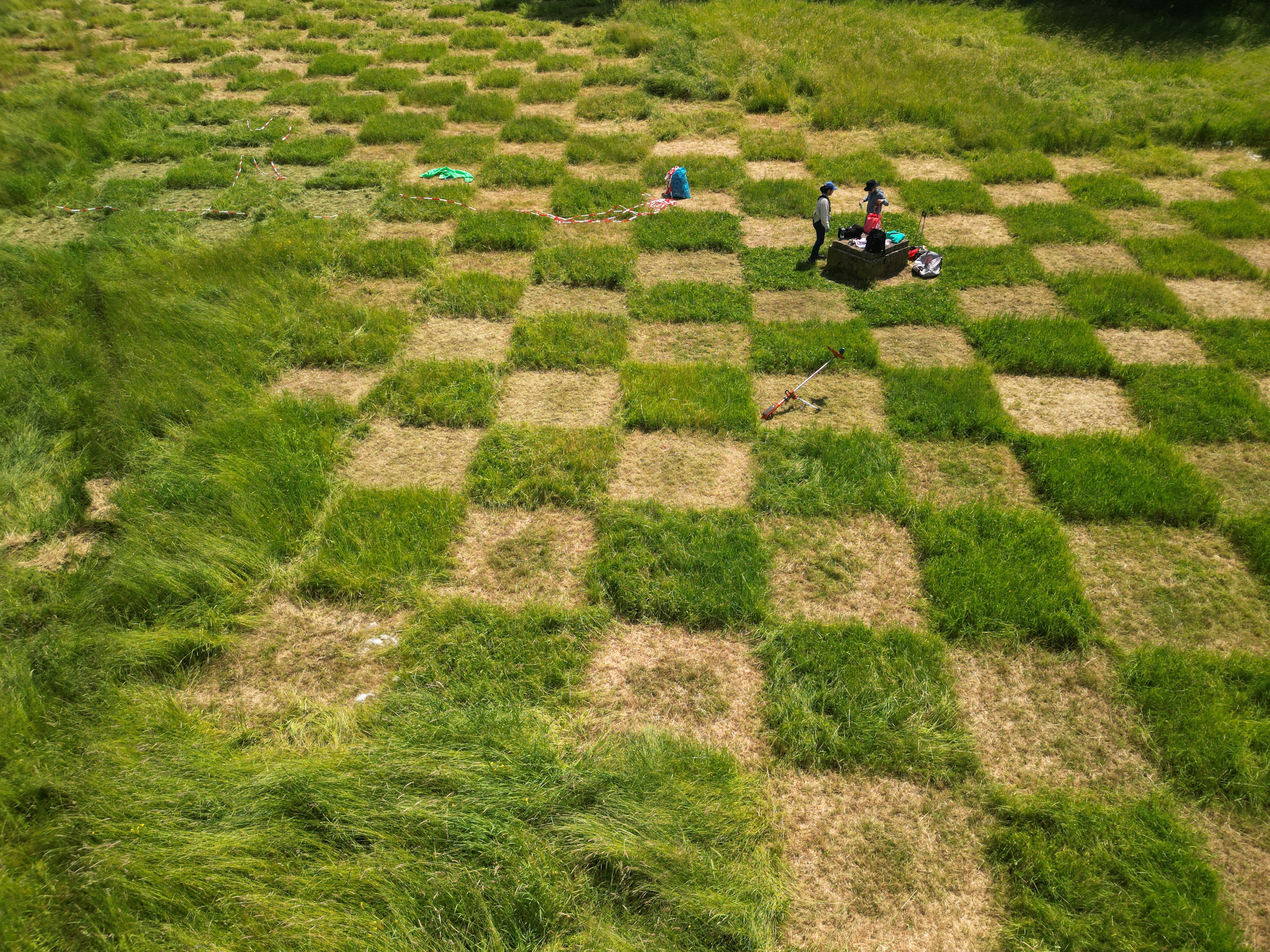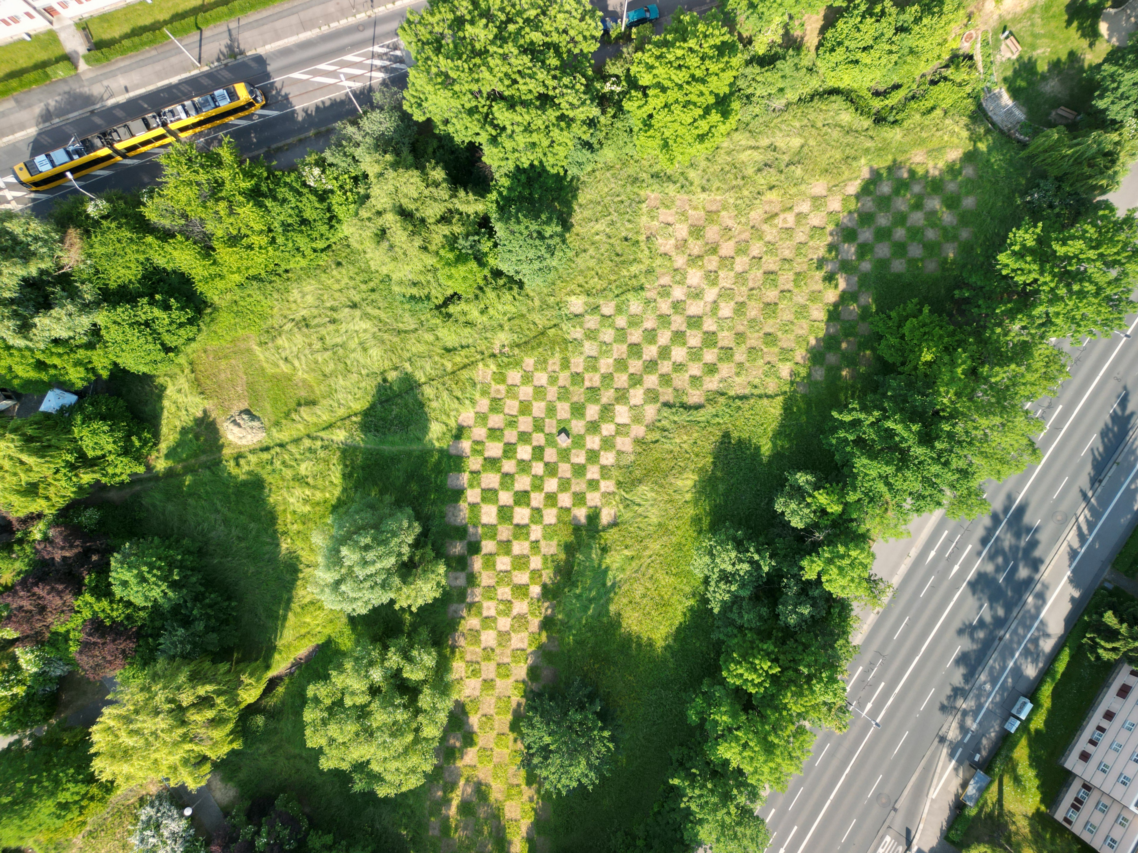 Die Künstlerin Karen Kamiya hat die Arbeit “MUSTER” konzipiert, für die ein präzises Karomuster in die ungemähte Parkfläche hineingemäht wurde. Für das so entstandene Schachbrettmuster hatte die Künstlerin mehrere Helfende einbezogen und die Fläche vorab mittels Absperrband sorgfältig kartiert.