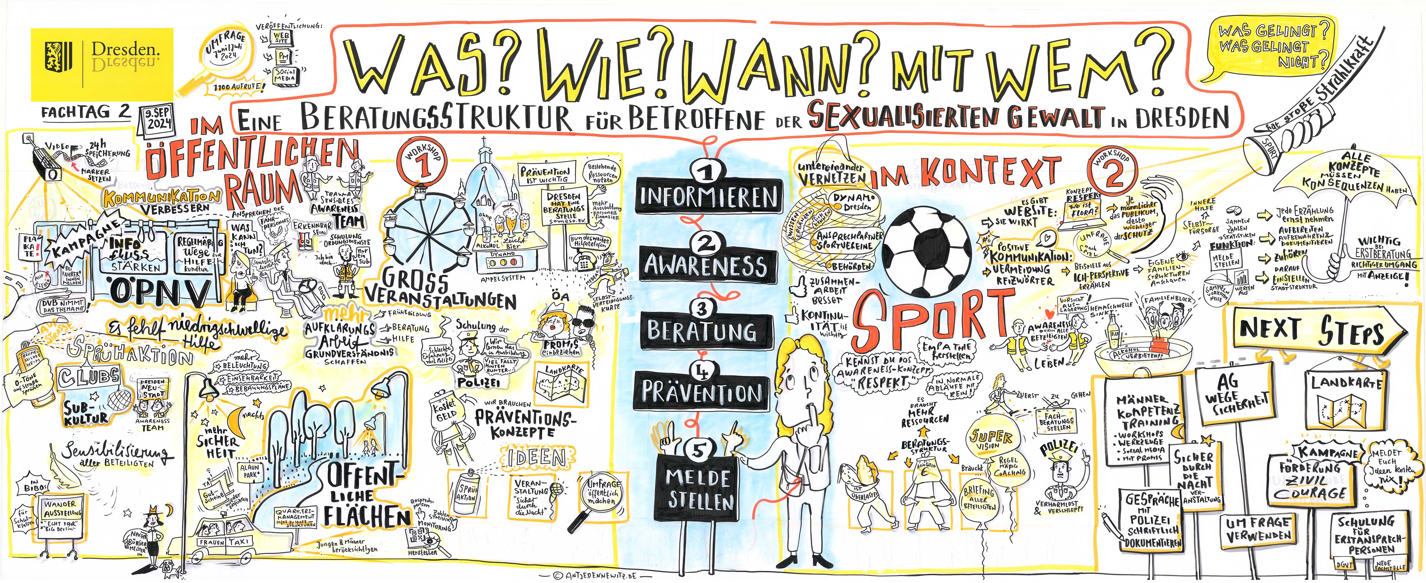 Im Fokus der Veranstaltung stand die Auseinandersetzung mit dem Problem der sexualisierten Gewalt im öffentlichen Raum - exemplarisch, aber nicht ausschließlich, im Kontext von Sportveranstaltungen. Ein wesentlicher Bestandteil des Fachtages war die Diskussion über die bisherige und künftige Struktur adäquater Beratungs- und Hilfsangebote in der Landeshauptstadt. Zudem wurden erste weitere Schritte im Umgang mit dem Thema diskutiert.