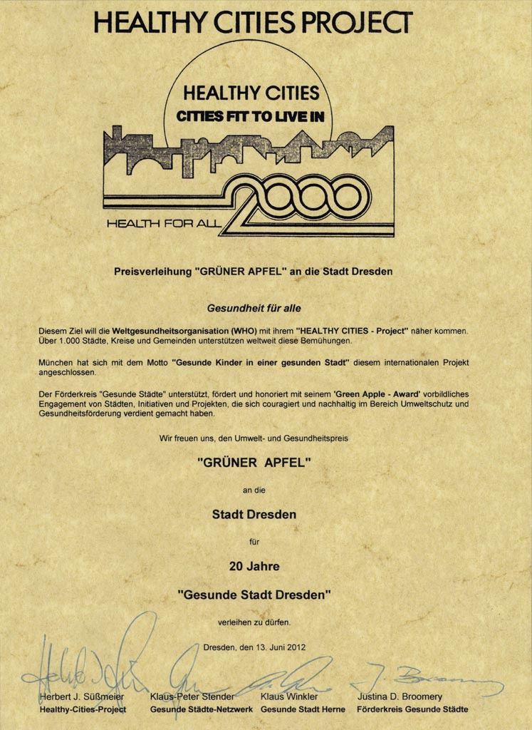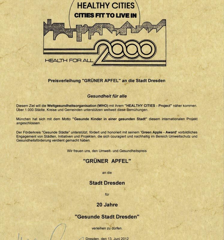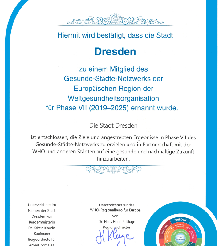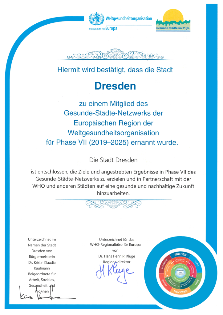 Dresden engagiert sich im WHO-Projekt „Gesunde Städte“. Damit verpflichtet sich die Stadt der Ottawa-Charta von 1986, das Thema Gesundheit in alle politische Entscheidungsfindungen einzubeziehen. So soll langfristig ein Beitrag zur Verbesserung des körperlichen, geistigen und sozialen Wohlbefindens der Bürgerinnen und Bürger geleistet werden.