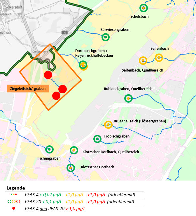 Im Rahmen eines Messprojekts hat das LfULG Wasserproben in einzelnen Oberflächengewässern der Gemarkungen Hellerau, Lausa und Weixdorf genommen. Die Analyse der Wasserproben ergab teils erhöhte PFAS-Konzentrationen. Besonders betroffen sind die Bereiche Ziegeleiteichgraben und Ziegeleiteich. Die Stadtverwaltung hat daraufhin weitere Untersuchungen eingeleitet.