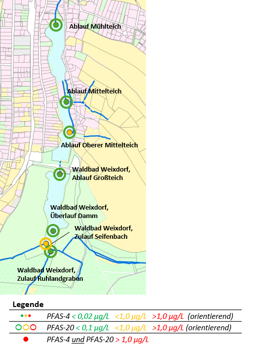 - Entlang der Teichkette Weixdorf wurde der auffälligste Befund am Zulauf Seifenbach ermittelt (0,057 µg/L PFAS-4, 0,153 µg/L PFAS-20).