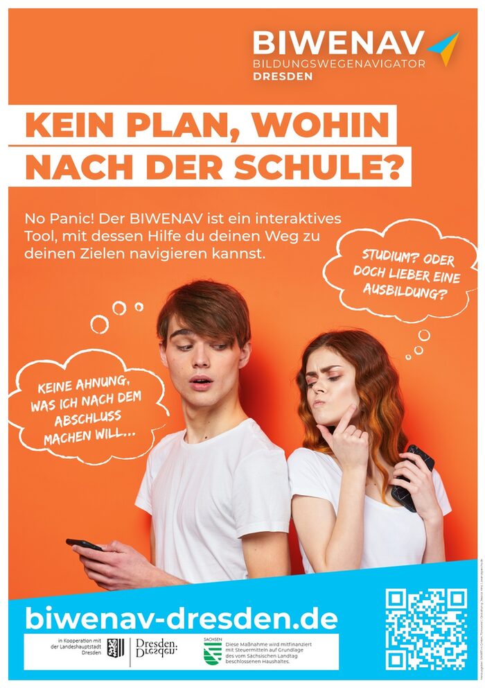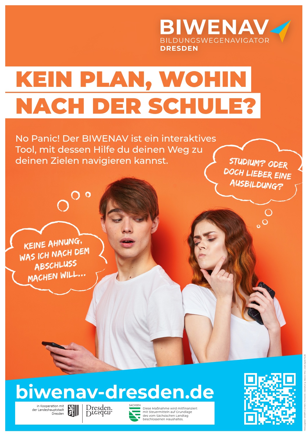 Der Bildungswegenavigator BIWENAV ist ein digitales Tool, das Jugendliche im Rahmen ihrer Beruflichen Orientierung durch die verschiedenen Möglichkeiten nach dem Schulabschluss navigiert. Ihnen werden direkt online mögliche Bildungswege, berufliche Wege oder Beratungsangebote in Dresden aufgezeigt.