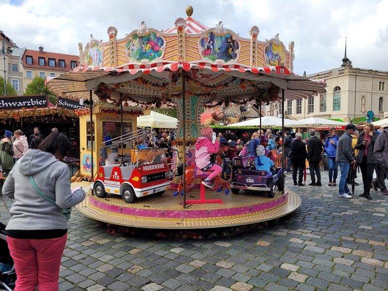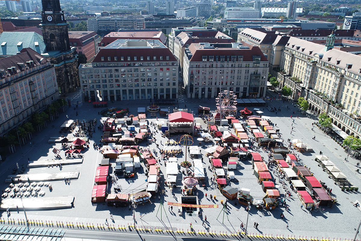 Der Dresdner Herbstmarkt verwandelt den Altmarkt im Herzen der Stadt alljährlich in einen quirligen Treffpunkt für Einwohner und Besucher der Stadt. In herbstlichem Dekor und klassischem Marktflair fühlen sich Familien genauso wohl wie gute Freunde und Kollegen. Die feierliche Eröffnung mit dem traditionellen Fassbieranstich sorgt direkt zum Start für gute Laune. Anschließend laden täglich 73 Händler mit ihren Ständen zum Bummeln, Probieren und Schlemmen ein. Von regionalen Leckerbissen über Handwerk und Ausschank bis zu klassischen Haushaltwaren erwartet Sie ein abwechslungsreiches Angebot. Kleine und große Besucher dürfen sich auf nostalgische Highlights wie das Riesenrad, die Eisenbahn und das Kinderkarussell freuen.