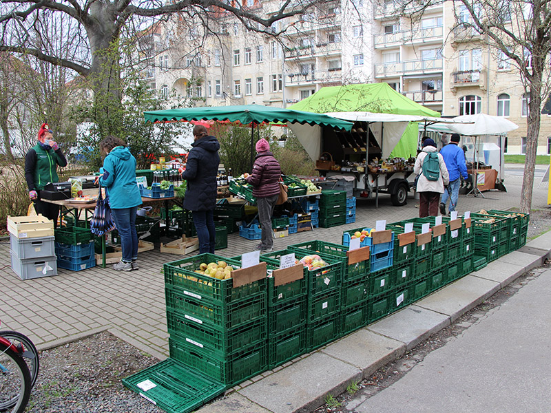 Auf dem Wochenmarkt Münchner Platz in der Südvorstadt bieten jeden Mittwoch Direkterzeuger ihre Waren an. An 24 Ständen sind die meisten Sortimente gleich mehrfach vertreten. Es gibt zwei Bäckereien, drei Anbieter von Molkereiprodukten sowie acht Stände mit Obst und Gemüse. Die familiengeführte Gärtnerei Kießlich/Münch aus Radebeul verkauft regionales Gemüse entsprechend der Jahreszeit. Sie baut fünf Sorten Paprika, Salate und Wurzelgemüse an. 15 verschiedene Kräuter, Beet- und Balkonpflanzen sind an ihrem Stand zu finden, im Sommer auch Schnittblumen. Bio-Obst und -Gemüse und weitere schmackhafte Lebensmittel kommen von Erzeugern und Bauernhöfen aus dem Dresdner Umland, der Lausitz und anderen sächsischen Regionen. Es gibt Säfte vom Kelterer aus Wurzen, alkoholfreies Bio-Bier aus Wittichenau, Champignons aus Thiendorf, Lausitzer Spezialitäten und Leinöl aus der Lausitzer Ölmühle in Hoyerswerda. Verkauft werden Bio-Aroniaprodukte aus Dresden, saisonales einheimisches Obst vom Bauern nebenan, Beerenobst aus Helbigsdorf, Bio-Obst aus Coswig, Bio-Eier aus Königsbrück sowie Bio-Gemüse aus Moritzburg und Ostrau bei Döbeln.