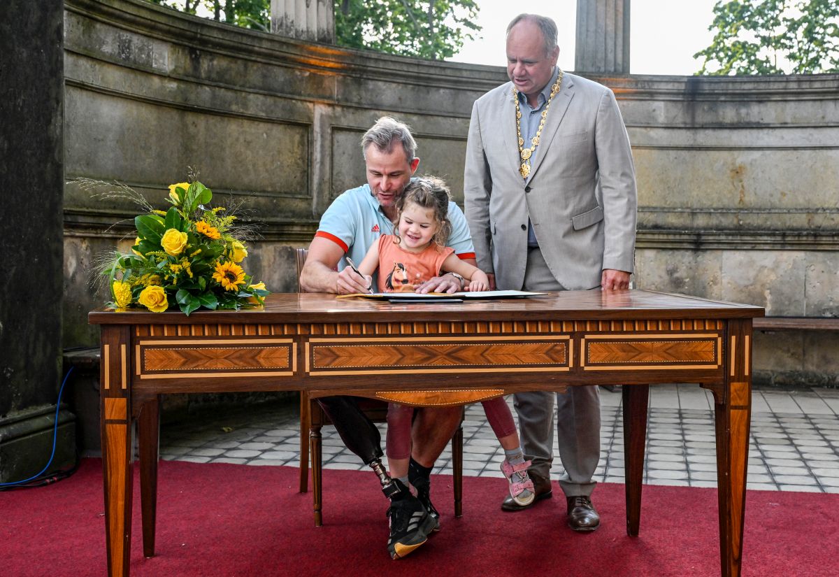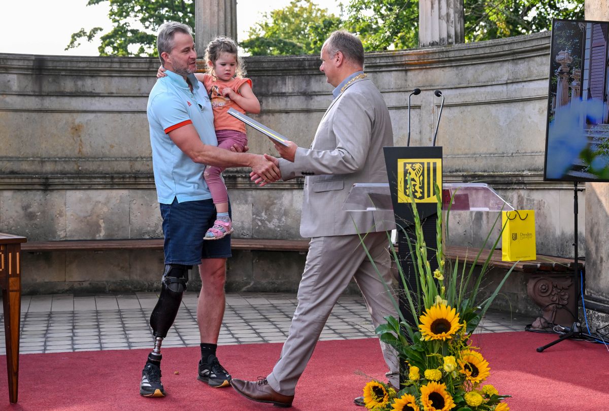 Oberbürgermeister Dirk Hilbert zeichnete am Donnerstag, 21. August 2025, Spitzensportlerinnen und -sportler sowie neue Talente mit dem Sport- und Förderpreis der Landeshauptstadt Dresden aus. Auf Schloss Albrechtsberg prämierte er ihre herausragenden Leistungen bei internationalen Wettkämpfen.