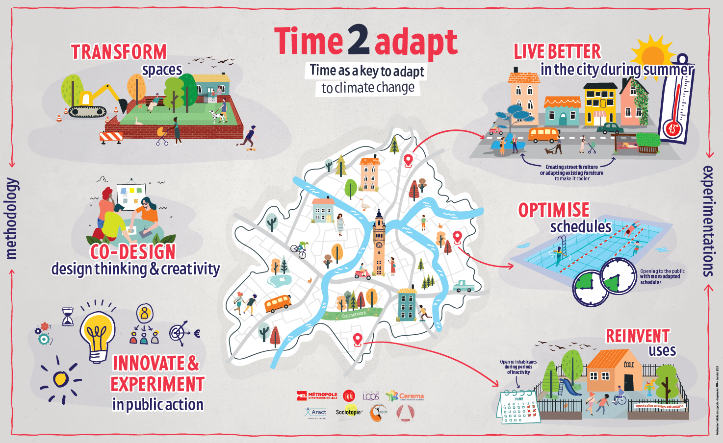 Das Projekt Time2Adapt ist ein europäisches Innovationsprojekt, das von der Métropole Lille (Frankreich) koordiniert wird und zeitbasierte Lösungen zur Anpassung an den Klimawandel in städtischen Räumen entwickelt. Es zielt darauf ab, bestehende städtische Räume und öffentliche Einrichtungen durch temporäre Maßnahmen in den Sommermonaten klimaresilienter zu gestalten und durch soziale Teilhabe einen besseren Zugang zu ermöglichen. Dazu gehört z.B. die Optimierung von Öffnungszeiten öffentlicher Einrichtungen wie Museen, Bibliotheken oder Schwimmbäder, um während einer Hitzewelle "kühle Orte" zu schaffen. So sollen soziale und klimatische Ungleichheiten verringert werden.