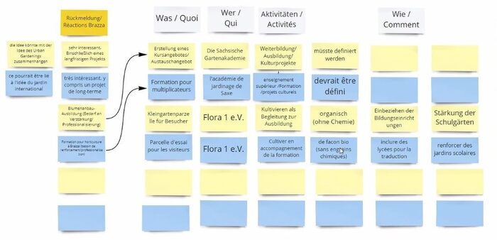 Nach einer kurzen Vorstellungsrunde berichtete das Dresdner Amt für Stadtgrün und Abfallwirtschaft von den Besuchen urbaner Gartenflächen in Brazzaville und Dresden. Auf großes Interesse stießen die unterschiedlichen Ansätze, welche in Brazzaville verfolgt werden und vom Direktor für Landwirtschaft und städtische Ernährung der Stadtverwaltung Brazzaville vorgestellt wurden. Im Anschluss waren alle Teilnehmenden eingeladen, erste Projektideen zu diskutieren und nächste Schritte zu formulieren. Auf einem digitalen Whiteboard wurden die Ideen dokumentiert. Für die weitere Zusammenarbeit wurde schließlich ein Projekt-Koordinationsteam, bestehend aus dem Direktor für Landwirtschaft und städtische Ernährung und dem Direktor für Außenbeziehungen und Kooperation in Brazzaville, sowie der Koordinatorin für kommunale Entwicklungspolitik im Bürgermeisteramt der Stadt Dresden festgelegt.
