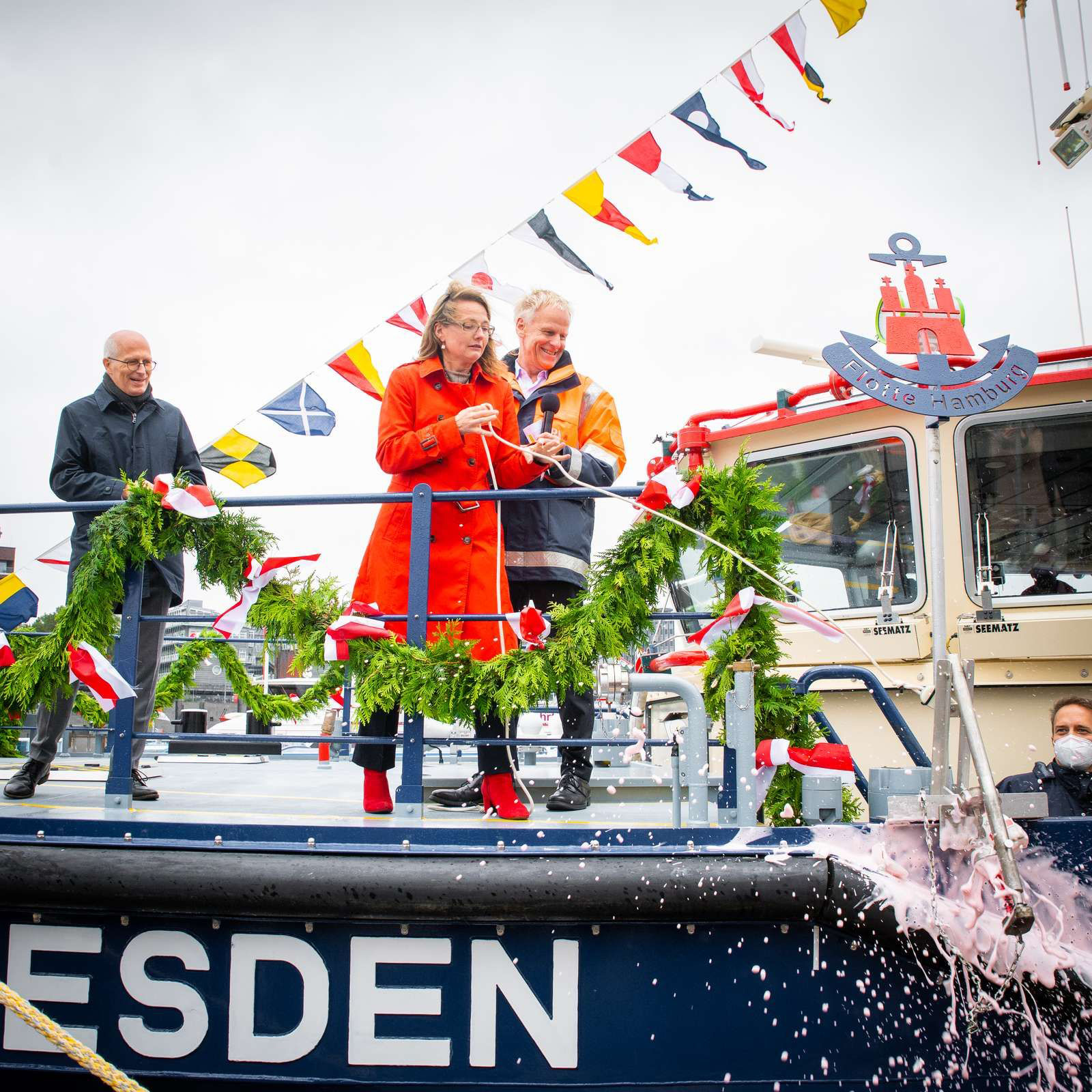 Dresdens Zweite Bürgermeisterin Annekatrin Klepsch und Hana Třeštíková, Kulturstadträtin aus Prag, tauften im Rahmen einer feierlichen Doppeltaufe am 23. September 2021 zwei neue Feuerlöschboote der Hamburger Flotte auf die Namen „Dresden“ und „Prag“. Im Beisein von Hamburgs Erstem Bürgermeister Dr. Peter Tschentscher und dem Chef der Hamburg Port Authority Jens Meier ging es im Anschluss auf eine kurze Probefahrt in den Hamburger Hafen. Die beiden baugleichen Schiffe bilden den Auftakt zur neuen Namensgebungsreihe „Hamburger Partnerstädte“ der Flotte Hamburg. Die innovativen Löschboote sind multifunktional ausgelegt und können in Zukunft für Aufgaben der Feuerwehr Hamburg sowie der Hamburg Port Authority (HPA) eingesetzt werden.