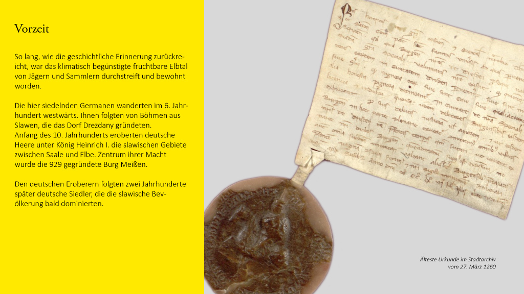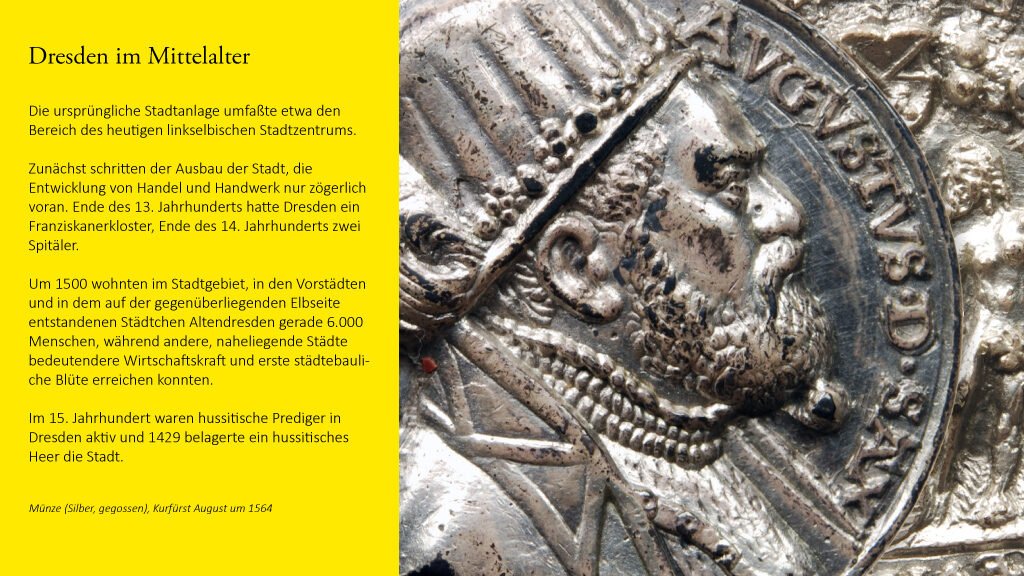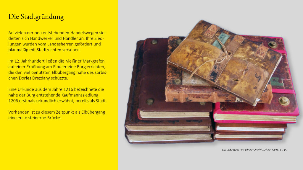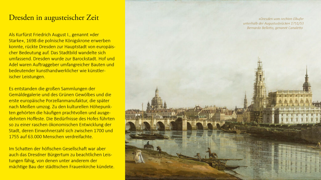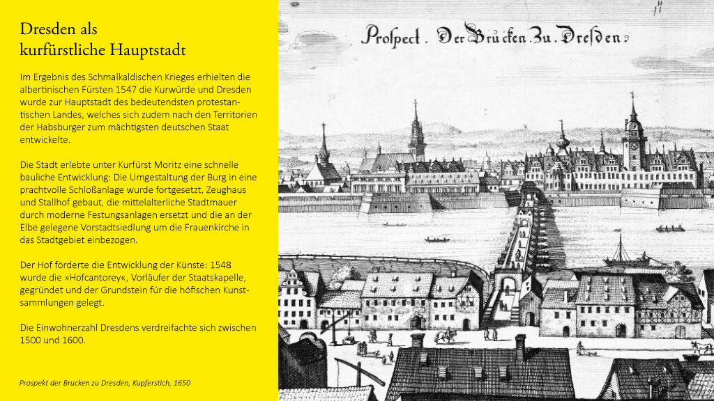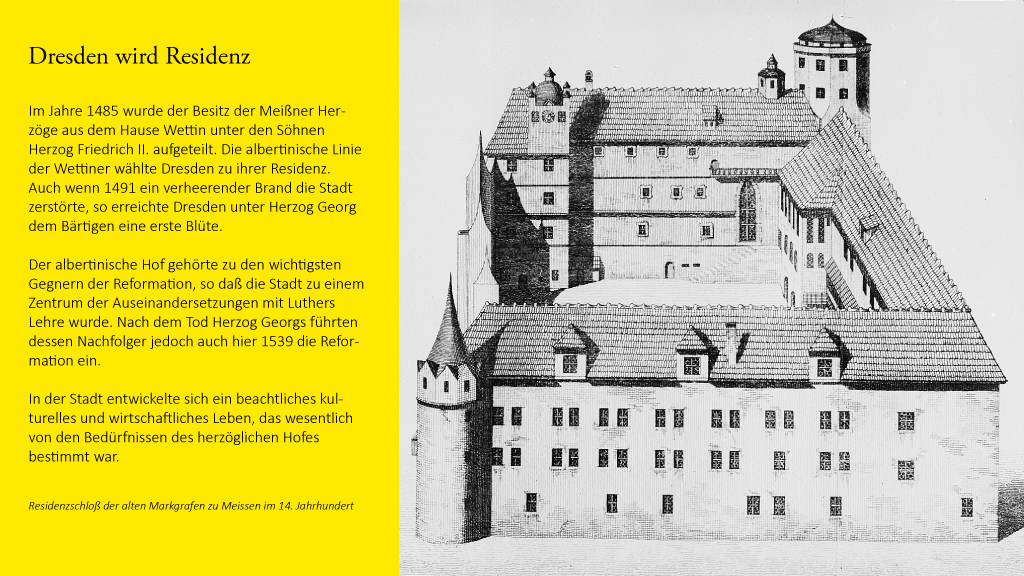 Gegründet am Ort eines slawischen Fischerdorfs als Kaufmannssiedlung und landesherrliche Burg, war Dresden seit dem 15. Jahrhundert Residenz der sächsischen Herzöge, Kurfürsten und später Könige.