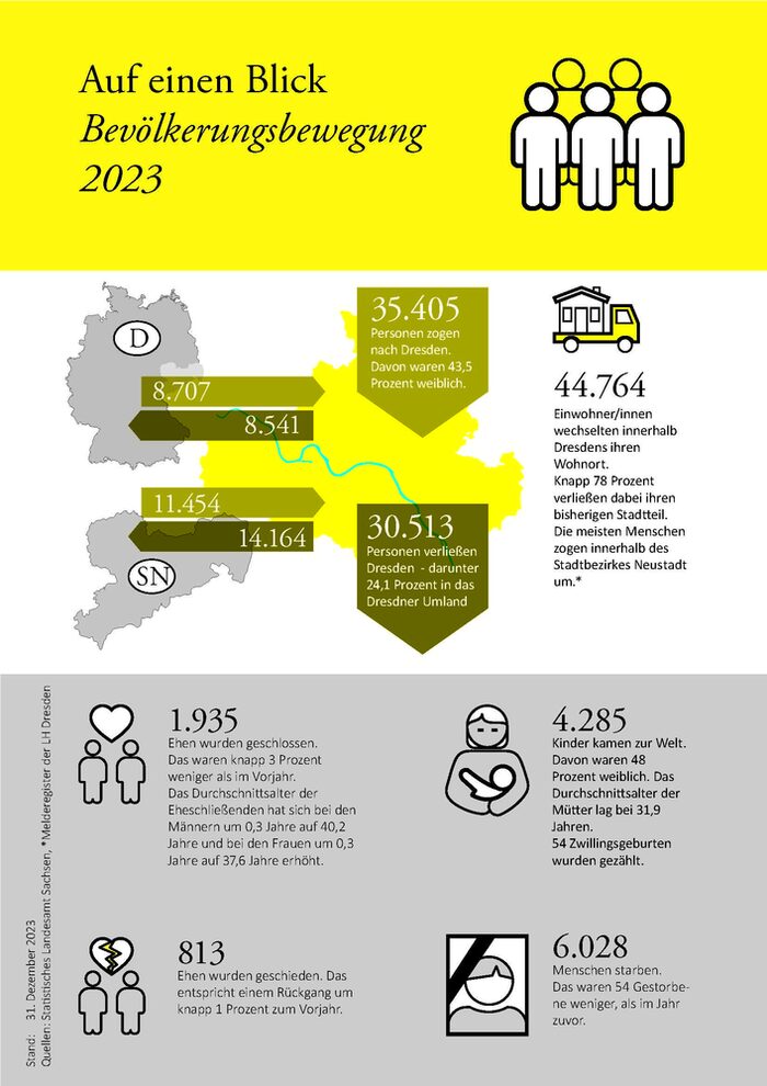 Im Jahr 2024 verzeichnete Dresden 31.039 Zuzüge, 28.132 Fortzüge, 4.106 Lebendgeborene und 5.816 Gestorbene (Quelle: Melderegister der LH Dresden).