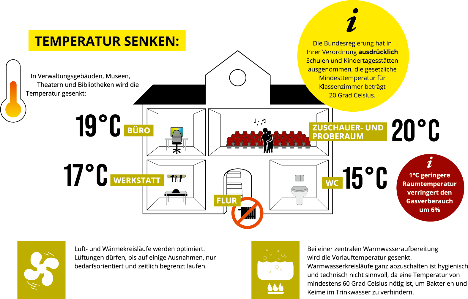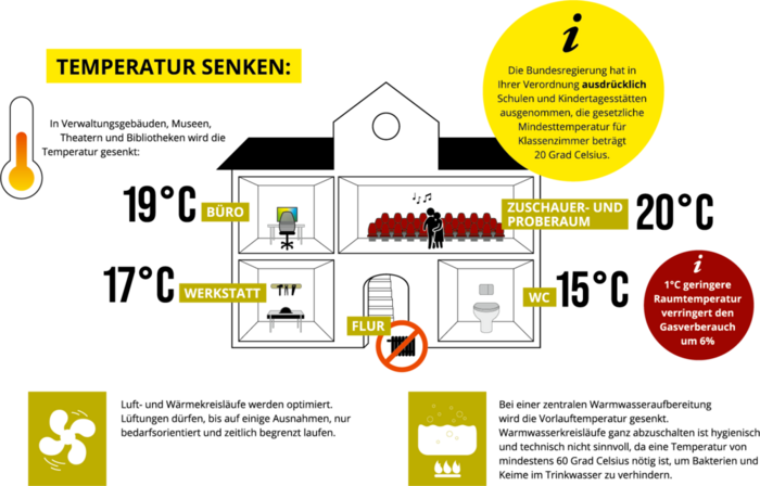 In Verwaltungsgebäuden, Museen, Theatern und Bibliotheken wird die Temperatur gesenkt: in Büros auf 19 Grad, Zuschauer- und Proberäume auf 20 Grad, Toiletten auf 15 Grad und Werkstätten auf 17 Grad. Heizungen in Treppenhäusern und Fluren werden abgeschaltet.