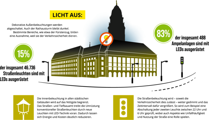 Außenbeleuchtungen werden ab Donnerstag, 1. September abgeschaltet. Auch der Rathausturm bleibt dunkel. Ausnahmen, wie beispielsweise der Fürstenzug bleiben an, weil sie der Verkehrssicherheit dienen.