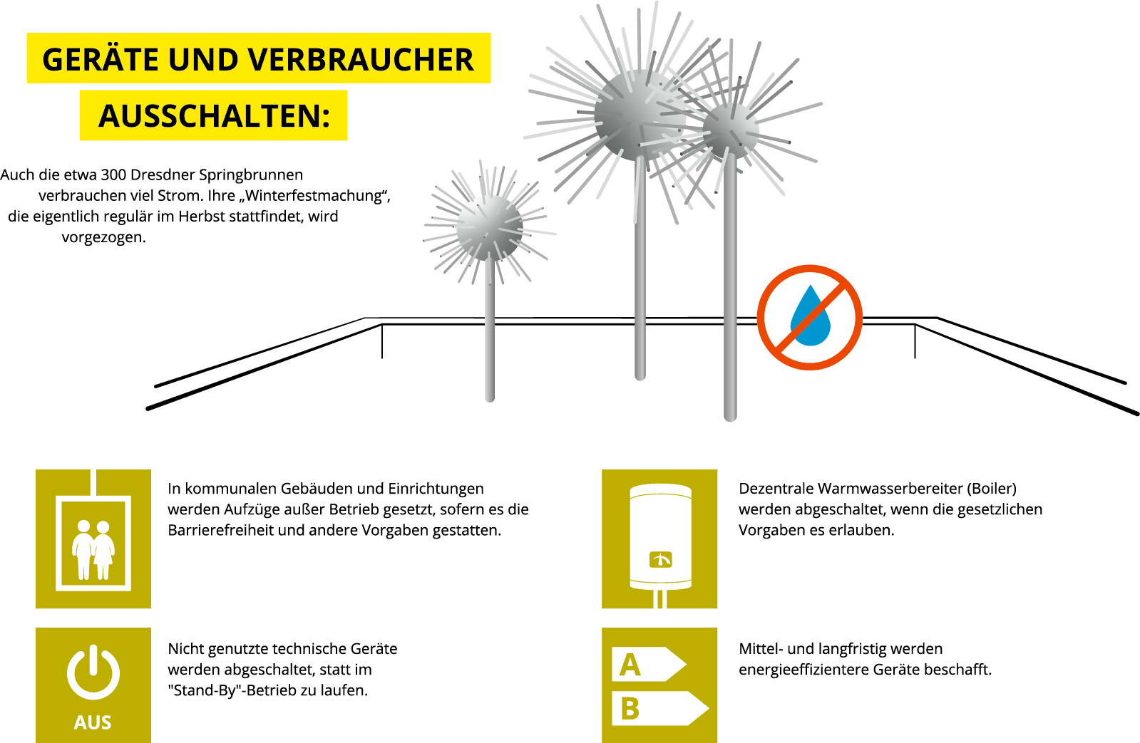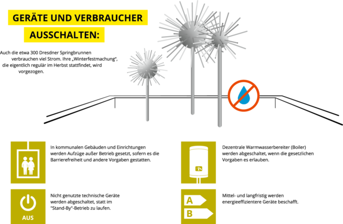 Dezentrale Warmwasserbereiter (Boiler) werden abgeschaltet. Auch die etwa 300 Dresdner Springbrunnen verbrauchen viel Strom. Ihre „Winterfestmachung“, die eigentlich regulär im Herbst stattfindet, wird jetzt vorgezogen.