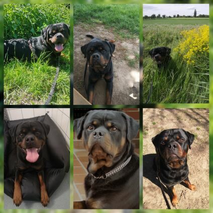 Zeus hat leider seinen Weg zu uns gefunden, da sein Besitzer erkrankte. Er ist ein gestandener und ernstzunehmender Rüde, der schnell zeigt, wen er mag und wer bitte auf Abstand bleiben soll. Seinen Bezugspersonen jedoch vertraut er und zeigt sich bisweilen mit diesen absolut alltagstauglich. Egal ob fremde Menschen, andere Tiere oder Straßenverkehr, mit seinen Menschen meistert Zeus alles ganz souverän. Beim Spielen ist er Rottweilertypisch sehr grob und kippt auch schnell in ein Dominanzverhalten. Erkennt man die Zeichen rechtzeitig, kann man ihn aber gut lenken und wieder herausrufen. Die Grundkommandos sitzen und mit ein paar Leckerlis werden diese gleich noch viel lieber ausgeführt. Auch an Zeus geht sein Alter nicht spurlos vorbei, so wurde beim Röntgen cauda equina festgestellt, womit er aber derzeit noch gut umgehen kann und nur bei Bedarf Schmerzmittel benötigt. Alles in allen zeigt sich Zeus bei uns als ein Rottweiler wie aus dem Lehrbuch. Wir suchen deshalb für ihn Menschen, die mit dieser Rasse vertraut sind und seine loyale, wenn auch manchmal etwas grobe Art zu schätzen wissen.