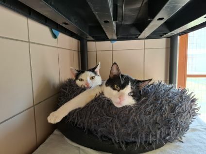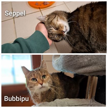Die Fundkatzen Seppel und Böhnchen gehören zu unseren Jungspunden und suchen gemeinsam ein Zuhause. Sie haben sich bei uns kennen gelernt und angefreundet, liegen gern gemeinsam und betreiben gegenseitige Körperpflege. Das drollige Duo ist vom Charakter her sehr unterschiedlich. Während Seppel sehr forsch, neugierig und aufgeschlossen ist, hält sich Böhnchen meist im Hintergrund, ist abwartend und begutachtet ruhig die Lage. Doch Streicheleinheiten hat auch sie schon für sich entdeckt, auch wenn sie einen Moment braucht. Seppel hingegen klebt förmlich an einem und möchte überall mit dabei sein.