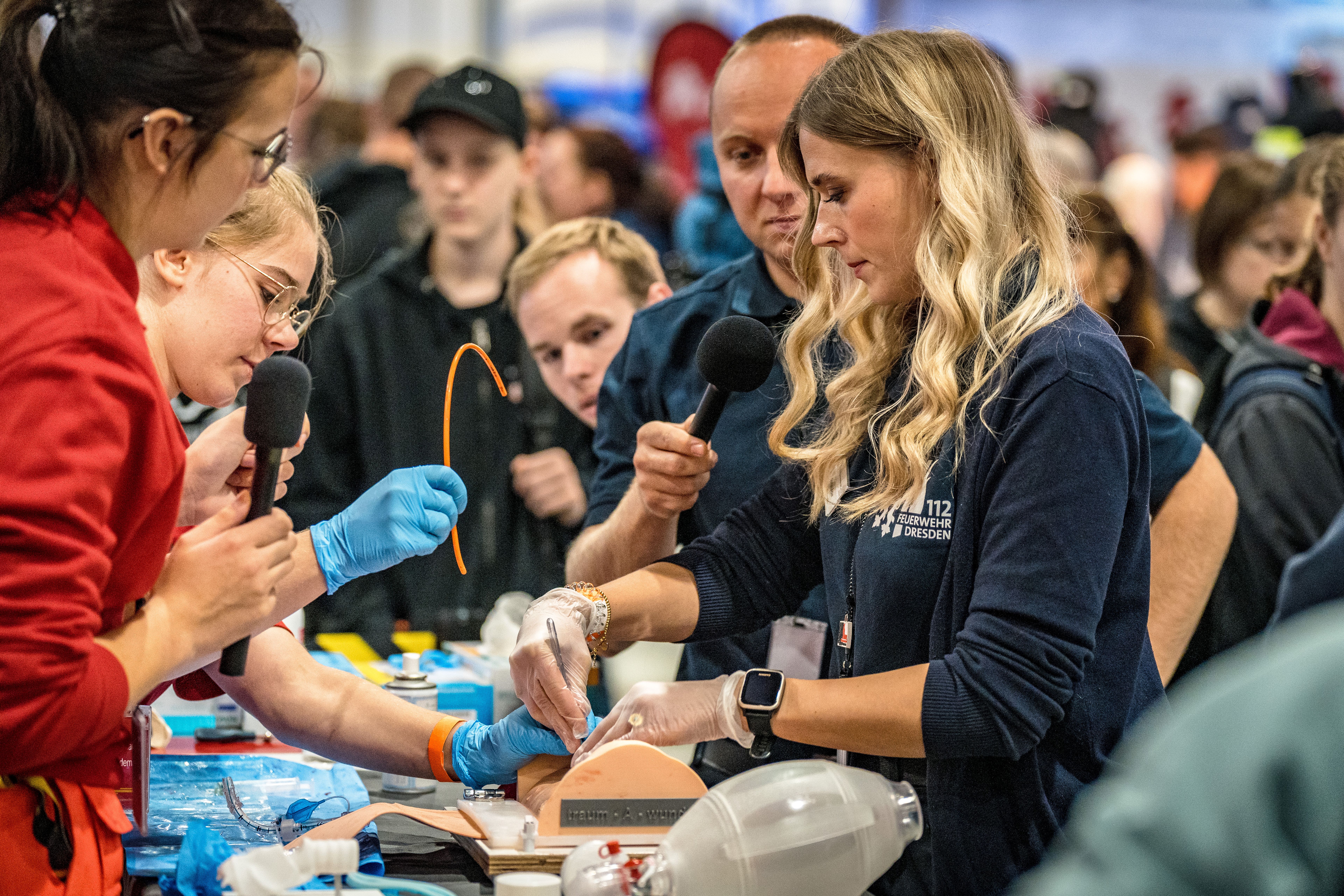 Der Rettungsdienst bildet einen weiteren Schwerpunkt am Messestand. Angehende Notfallsanitäterinnen und Notfallsanitäter der Berufsfeuerwehren Leipzig und Dresden demonstrieren ihr Können in realistischen Einsatzszenarien. Verschiedene Skillstationen laden dazu ein, lebensrettende Maßnahmen wie die Blutstillung oder die Beatmung mit Beutel und Gerät nachzuvollziehen. Diese praxisnahen Vorführungen verdeutlichen die hohen Anforderungen an medizinisches Wissen, Reaktionsvermögen und mentale Stärke im Rettungsdienst – einem zentralen Aufgabenfeld der Berufsfeuerwehren.