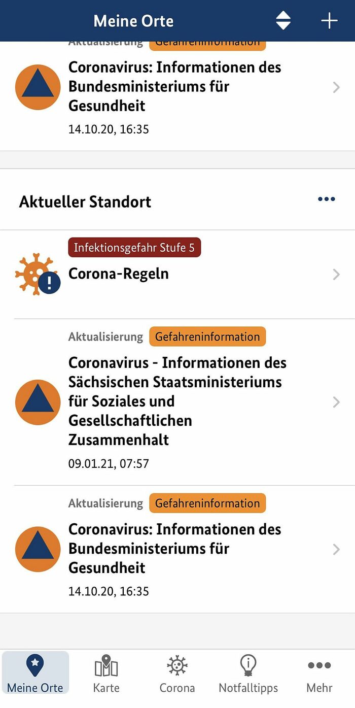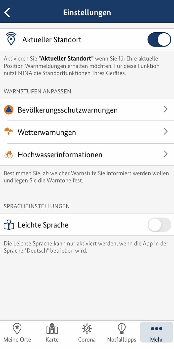 Über diese App können Sie wichtige Warnmeldungen des Bevölkerungsschutzes für unterschiedliche Gefahrenlagen wie zum Beispiel Gefahrstoffausbreitung oder einen Großbrand erhalten. Wetterwarnungen des Deutschen Wetterdienstes und Hochwasserinformationen der zuständigen Stellen der Bundesländer sind ebenfalls in die Warn-App integriert.