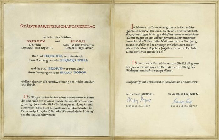 Die weltweite Anteilnahme nach der Katastrophe war außerordentlich: mehr als 75 Länder leisteten internationale Hilfe in den folgenden Jahren, darunter auch die DDR. In Dresden befand sich damals das Generalsekretariat des Deut-schen Roten Kreuzes der DDR. Als im November 1965 eine Delegation aus Skopje in Dresden war, um dem Präsidium des Deutschen Roten Kreuzes eine besondere Auszeichnung für die humanitäre Hilfe zu überreichen, regten die Gäste auch den Abschluss eines Freundschaftsvertrages an. Nach der Zustimmung durch die Vertreter beider Städte in der ersten Jahreshälfte 1966 wurden dann im Oktober die Verhandlungen für die Vorbereitung der Städtepartnerschaft geführt. Der Programmentwurf aus Skopje sah etwa den Erfahrungsaustausch im Bereich der Verkehrs- und Grünflächenplanung, Kooperationsprojekte kultureller Institutionen und Schulen sowie den Austausch von Bild- und Filmmaterial zur Förderung des Tourismus vor. Im Juni 1967 wurden Artikel der beiden Oberbürgermeister in der Presse veröffentlicht, die den Einwohnerschaften einige Eindrücke über die zukünftige Partnerstadt vermitteln sollten. Nach Abschluss der Vertragsunterzeichnung im November 1967 verwies Blagoj Popov noch einmal auf die Erfahrung der Zerstörung der Städte als wichtige Gemeinsamkeit. Erste Vorschläge für Kooperationen in den Jahren 1968 und 1969 waren unter anderem eine Ausstellung über die Werktätigen Dresdens in Skopje und ein Informationsaustausch von Architekten und Bauingenieuren in Dresden über Stadtplanung und Bauwesen. Die Stadt am Fluss Vardar war die vierte Partnerstadt Dresdens. Eine Erneuerung der Vereinbarungen erfolgte im Jahr 1995. Nach wie vor sind Städtepartnerschaften eine wichtige Grundlage dafür, andere Kulturen kennen zu lernen und Freundschaften zu schließen. Interessierte können im Internet oder unter der E-Mail-Adresse europa@dresden.de weitere Informationen über die Dresdner Partnerstädte erhalten.