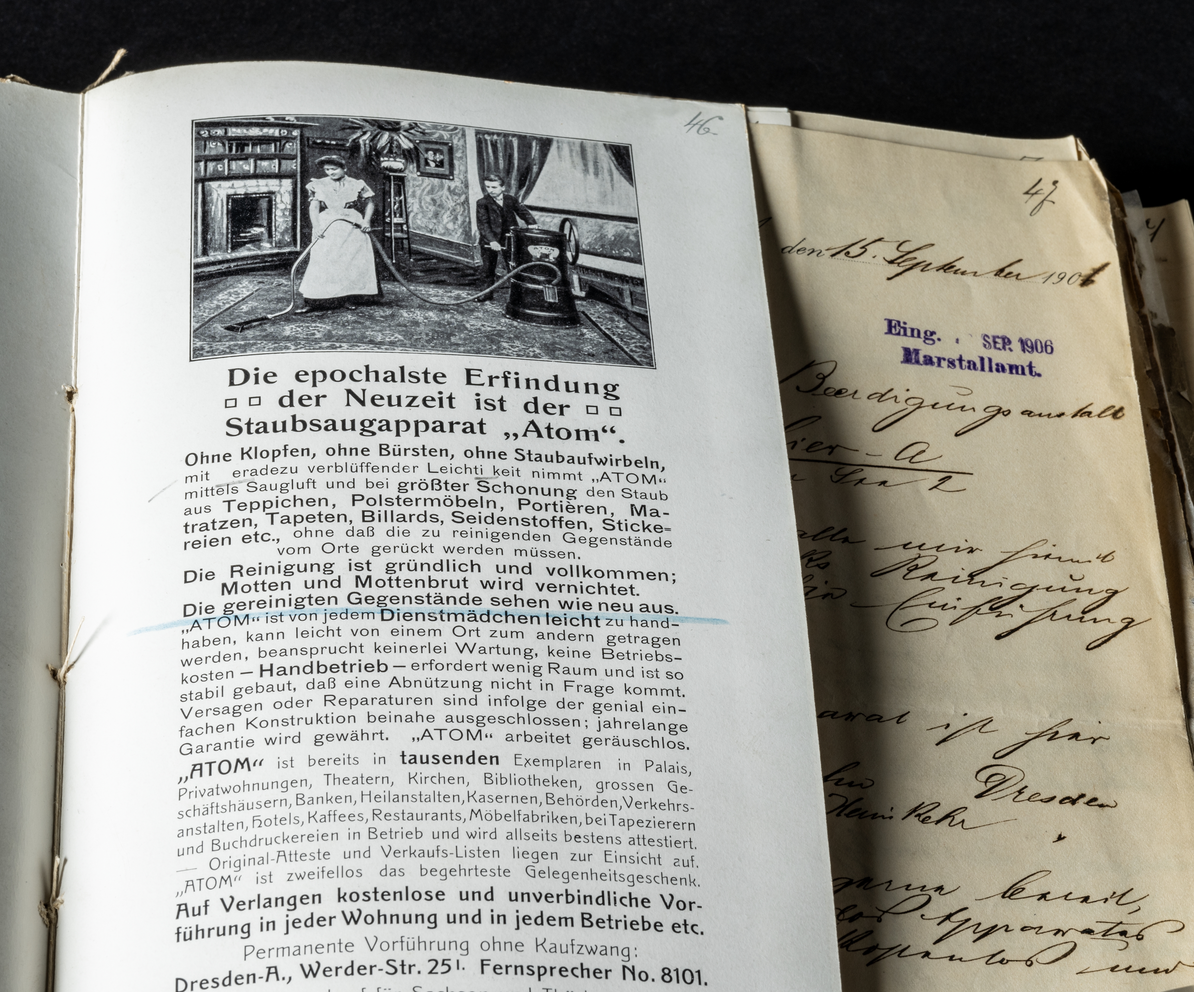 Im Oktober 1906 wandte sich der in Dresden ansässige Geschäftsmann Edmund Kussi (1866–1935) mit verschiedenen Broschüren zum Staubsaugapparat „Atom“ an das Marstall- und Bestattungsamt der Stadt Dresden. Der nahe Pilsen geborene Kussi war 1906 mit seiner Familie nach Dresden gezogen und wurde in den Adressbüchern als „Alleinvertrieb des Staubsaugapparates ›Atom‹ für Sachsen und Thüringen“ geführt. Eigentlicher Hersteller war der Österreicher Gustav Robert Paalen (1873-1945). Bereits kurz nach der Jahrhundertwende hatte Paalen US-Patente für die Staubsaugerapparate „Santo“ und „Atom“ erworben und diese erfolgreich weiterentwickelt. Erster Einsatzort war unter anderem die Wiener Hofburg. Dieser elitäre Kunde öffnete auch andernorts die Türen, wie der Vertriebler Kussi in seiner Werbebroschüre zum Staubsaugapparat „Atom“.