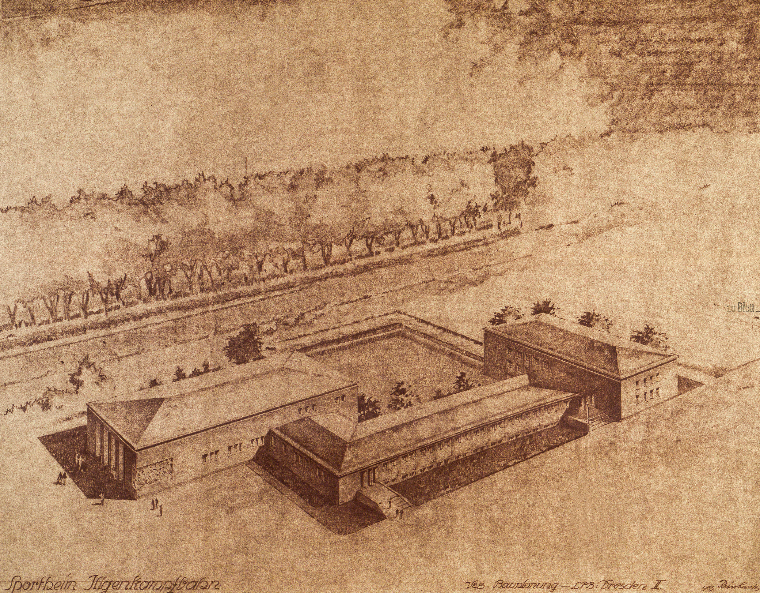 Im November 1945 beantragte die „Druckerei Sächsische Volkszeitung“ bei dem Amt für Wiederaufbau eine „schnellste Einrichtung des Druckreibetriebes“. Laut Antrag waren dafür aufwendige Umbaumaßnahmen notwendig. Es handelte sich dabei um die Industrieanlage „Goehle-Werk“ der Zeiss Ikon AG im Stadtteil Pieschen, in der bis zum Kriegsende Sprengkapseln und Zünder, insbesondere durch Zwangsarbeiter angefertigt wurden. Die Bebauung des Areals zwischen Großenhainer Straße, Heidestraße und Riesaer Straße erfolgte, ausgenommen von der Nähmaschinenfabrik der Firma „Clemens Müller“ (später Werk B), zwischen 1938 und 1940. Bauliche Veränderungen, insbesondere für die neu zu errichtenden Sprengstofflager sind noch bis Ende April 1945 nachzuweisen. Die Industrieanlage gehörte zu einem der größeren Rüstungsbetriebe in Dresden. Das Produktprofil der Zeiss Ikon AG wurde gegen Ende der dreißiger Jahre wesentlich durch den stark gestiegenen Rüstungsbedarf aller Waffen der Wehrmacht/Reichsmarine bestimmt. Die Namensgebung erfolgte nach Herbert Goehle (1878-1947), Konteradmiral der Kriegsmarine. Bei der Archivalie des Monats handelt es sich um einen Entwurf aus den 1950er Jahren. Abgebildet ist das ehemalige Gemeinschaftshaus des Goehle-Werkes.