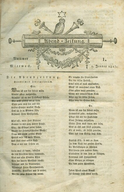 Vor 200 Jahren, am 1. Januar 1817, erschien die erste Ausgabe der „Abendzeitung“ in Dresden. Die Vorankündigung dazu „An die verehrten Einwohner von Dresden“ vom Dezember 1816 wirbt für ein Unterhaltungsblatt, das fern von Politik und „strengwissenschaftlichen Belehrungen“ dazu beitragen möchte, „mit guten Gedanken das Tagewerk zu beschließen“. Der Abend solle nicht mit Trübsal, sondern heiter und freundlich ausklingen, „kurz einem milden Sommerabende gleich seyn“. Die Begründer der „Abendzeitung“ waren Johann Christoph Arnhold als Verleger sowie Karl Gottfried Theodor Winkler und Friedrich Kind als Herausgeber. Unter dem Pseudonym Theodor Hell hinterließ Winkler zahlreiche Spuren in Dresden. Er war unter anderem beim Stadtgericht, im Geheimen Archiv, an der Kunstakademie sowie am Hoftheater tätig und engagierte sich in mehreren Vereinen. 1824 wurden ihm der Titel eines Sächsischen Hofrates und 1851 die Ehrenbürgerwürde von Dresden verliehen. Theodor Hell verfügte über umfangreiche Sprachkenntnisse und übersetzte ausländische Dramen und Operntexte für die deutsche Bühne. Er verfasste auch selbst Gedichte, Erzählungen und Komödien und gab mehrere Taschenbücher heraus. Sein „Dramatisches Vergißmeinnicht“ ist in der Bibliothek des Stadtarchivs vorhanden. Viele Beiträge der Abendzeitung stammen aus der Feder von Theodor Hell, so auch das Gedicht „Häusliches Gespräch“ auf der Titelseite der ersten Ausgabe. Darin bewirbt er die Zeitung als gemeinsame Feierabendlektüre für „sie“ und „ihn“. Die Abendzeitung erschien an sechs Wochentagen. Auf vier Seiten wurden Gedichte, Kurz- und Fortsetzungserzählungen, Rezensionen sowie Kunst- und Theaternachrichten aus dem In- und Ausland präsentiert.
