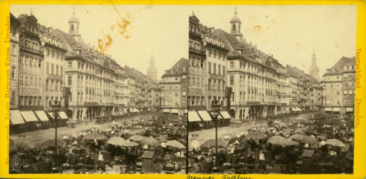 Wegen deren Abstandes von etwa 60 bis 70 Millimeter entwerfen sie auf ihren Netzhäuten zwei geringfügig voneinander verschiedene Bilder, die im Gehirn zu einem räumlichen Bild verschmolzen werden. Die Stereofotografie vollzieht dies nach und fügt so der „flachen“ Fotografie die dritte Dimension hinzu.“ Auf der abgebildeten Archivalie ist das lebhafte Markttreiben mit den Händlern und Käufern auf dem Altmarkt um 1865 dokumentiert. Am linken Bildrand befindet sich das Dresdner Rathaus, hervorgehoben durch den Dachreiter mit Uhr. Im Hintergrund zeichnet sich mittig die Silhouette des Hausmannsturms ab. An den Nachfolgebauten der 1950er Jahre ist der Standort des Altstädter Rathauses durch das Dachtürmchen markiert (heute: Eingang Altmarkt Galerie). Carl Hermann Julius Krone hatte es sich bereits in seinem Gesuch für das Bürgerrecht als Hauptaufgabe gestellt, die Stadt „mit besten Absichten“ zu dokumentieren. Seit 1849 verweilte Krone zeitweise in der Kunstakademie Dresden. Nach Erlangung des Bürgerrechts eröffnete er 1853 sein erstes Fotostudio auf Marienstraße 30 in der Nähe des Postplatzes. Das Stadtarchiv verwahrt neben den erworbenen Stereofotografien auch die Gewerbeakte von Carl Hermann Julius Krone mit Geschäftsbriefen, Rechnungen und anderen Gewerbeunterlagen.