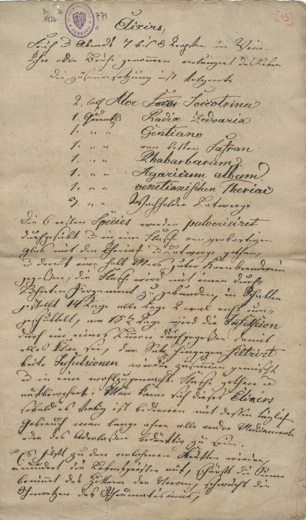 Ein Elixier zur Verlängerung des Lebens ist gewiss einer der sehnsüchtigsten Wünsche seit Menschengedenken. Im Stadtarchiv Dresden befindet sich tatsächlich ein vermeintliches Rezept hierfür. Es stammt aus dem Nachlass der Familien Schmidtgen und Werner und wurde vermutlich in der ersten Hälfte des 19. Jahrhunderts handschriftlich verfasst. Neben dem Rezept für das Elixier finden sich in dem im Jahre 1926 übernommenen Bestand weitere Anleitungen für die Herstellung verschiedener Heilmittel, etwa für einen Tee zur Blutreinigung, für ein „blaues Kalg Wasser“ zur Behandlung von Augenentzündungen und für Brandsalben. Nur drei Tropfen des Lebenselixiers am Morgen und sieben bis acht Tropfen am Abend mit Wein, Tee oder Brühe eingenommen, sollen das Leben auf wundersame Weise verlängern. Insgesamt werden acht besondere Zutaten zur Herstellung benötigt. Dazu gehört Aloe socotrina, eine Pflanzenart aus der Gattung der Aloen, von der zwei Lot, also etwa zwei volle Löffel, erforderlich sind. Außerdem wird ein Quentchen, das heißt etwa ein Viertel oder Fünftel eines Lots, von der Zitwerwurzel gebraucht, die auch als Weiße Curcuma bekannt ist und aus der Familie der Ingwergewächse entstammt. Des Weiteren ist die gleiche Menge Enzian, „bester“ Safran, Rhabarber, Lärchenschwamm sowie Wachholder Latwerge notwendig, letzteres ist eine eingedickte Saft-Honig-Zubereitung. Und nicht zuletzt muss venezianischer Theriak bereitgehalten werden, der bereits in der Antike ein Antidot zur Behandlung von Vergiftungen bezeichnete. Diese Kräutermixtur galt im Mittelalter sogar als universelles Wunderheilmittel, wobei der Theriak aus Venedig sensationelle Berümtheit erlangte. Zur Herstellung des Elixiers müssen zunächst die trockenen Zutaten pulverisiert, gesiebt und zusammen mit der Latwerge, dem Theriak und einem halben Maß eines guten Kornbranntweines in eine Flasche „von grobartigem Glas“ gefüllt werden. Diese wird mit einem durchlöcherten Pergament verschlossen, vierzehn Tage in den Schatten gestellt und täglich zweimal geschüttelt. Danach ist das Substrat durch ein reines Leinentuch zu filtrieren, wieder zu vermischen und in eine „wohlzugemachte“ Flasche zu füllen. Durch den täglichen Gebrauch soll das fertige Elixier angeblich Kräfte mobilisieren und die Lebensgeister wecken, außerdem die Sinne schärfen sowie Nervenzittern und Rheumaschmerzen lindern.