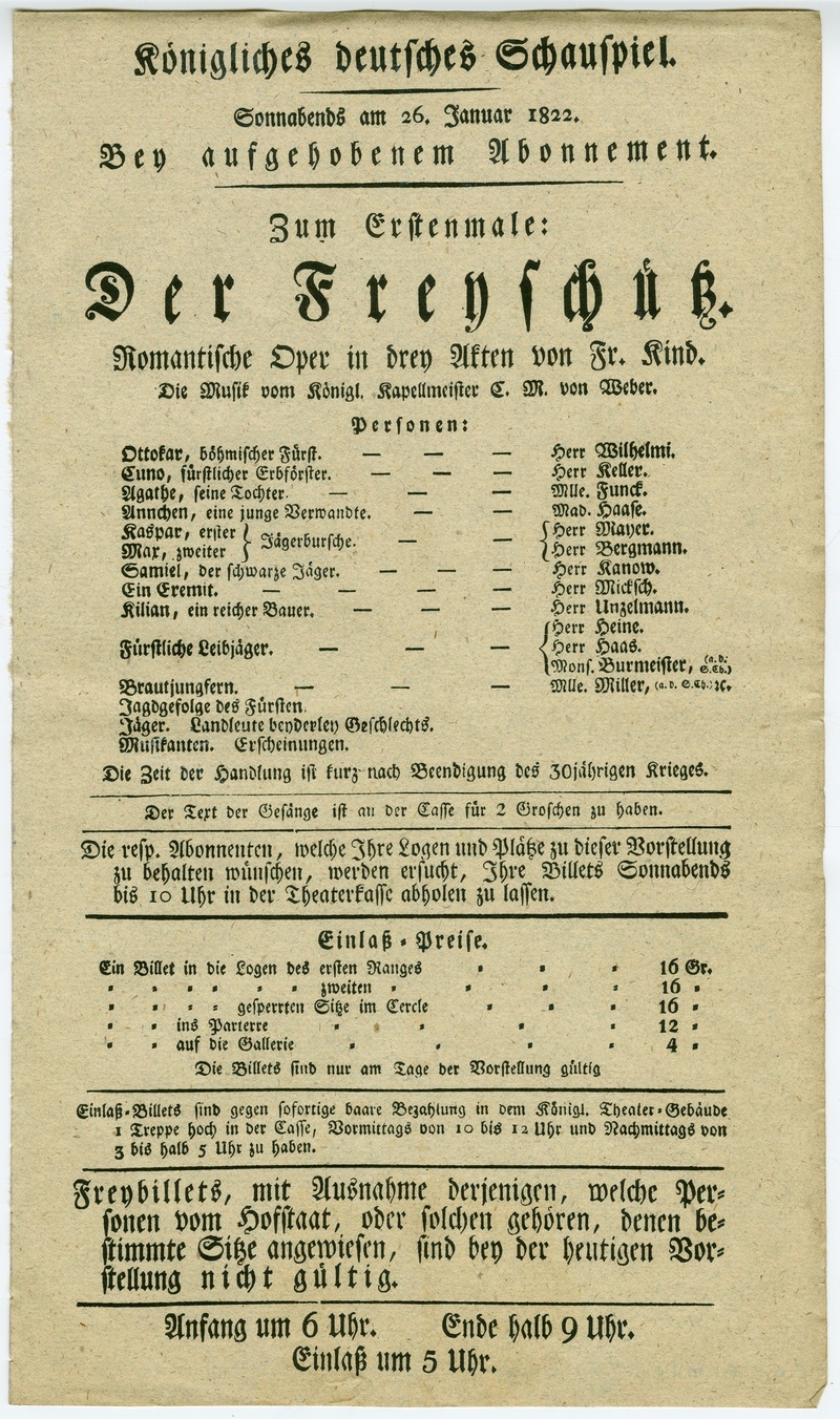 Am 29. Januar 1817 veröffentlichte die „Abend-Zeitung auf das Jahr 1817“ einen Artikel von Carl Maria von Weber (1786-1826) mit dem Titel: „An die kunstliebenden Bewohner Dresdens“. Weber, der Tage zuvor als Musikdirektor in Dresden begann, schrieb darin über die bevorstehende Gründung einer deutschen Opernanstalt, es scheint „dem Gedeihen der Sache zuträglich, ja vielleicht notwendig, dass derjenige, dem die Pflege und Leitung des Ganzen derzeit übertragen ist, Art, Weise und Bedingung zu bezeichnen sucht, unter welcher ein solches Unternehmen ins Leben treten kann.“ Der Intendant der Dresdner Hofoper, Heinrich Vitzthum von Eckstädt (1777-1837) sah in Carl Maria von Weber den geeigneten Musiker, für seine Idee neben der bestehenden italienischen Oper eine deutsche Oper zu verwirklichen. Weber erneuerte und veränderte Vieles im Opernbetrieb in Dresden und achtete beim Inszenieren auf die Einheit von Bühnenbild, Kostümen und Darstellungsstil mit Musik und Handlung. Dazu schrieb er bereits 1817: „Schmuck, Glanz und Enthusiasmus werden einer Kunstanstalt nur durch ausgezeichnete hohe Talente verliehen. Diese sind in der ganzen Welt selten. Bewahrt und festgehalten wo sie sind, sind nur die Zeit, und der Segen, der jedem menschlichen Beginnen allein Gedeihen bringen kann, im Stande, diese in der Folge zu verschaffen.“ Durch Webers Wirken wurde Dresden zu einem Zentrum der musikalischen Romantik. Seine Opern trugen zur Durchsetzung der deutschen Oper bei. „Der Freischütz“, uraufgeführt in Berlin am 8. Juni 1821, gehört seit seiner Premiere am 26. Januar 1822 in Dresden besonders eng zur Dresdner Operngeschichte. All das wird auch in der sehr ausführlichen Rezension der Dresdner Erstaufführung vom 26. Januar 1822 des Theaterkritikers Karl August Böttiger (1760-1835) in der „Abend-Zeitung auf das Jahr 1822“ deutlich. Man spürt beim Lesen die Bewunderung für die Musik von Carl Maria von Weber. Sehr genau wird das Zusammenspiel des gesamten Opernensembles gelobt, das Bühnenbild, die Bühnentechnik für die Wolfsschlucht, die zur Ausstattung der Szenen passenden Kostüme werden genau beschrieben. Die Hauptakteure werden namentlich genannt und ihr Gesang sowie ihr Spiel erläutert. Mit dem Freischütz wurde die Oper am 31. August 1944 geschlossen und nach dem Wiederaufbau am 13. Februar 1985 eröffnet.
